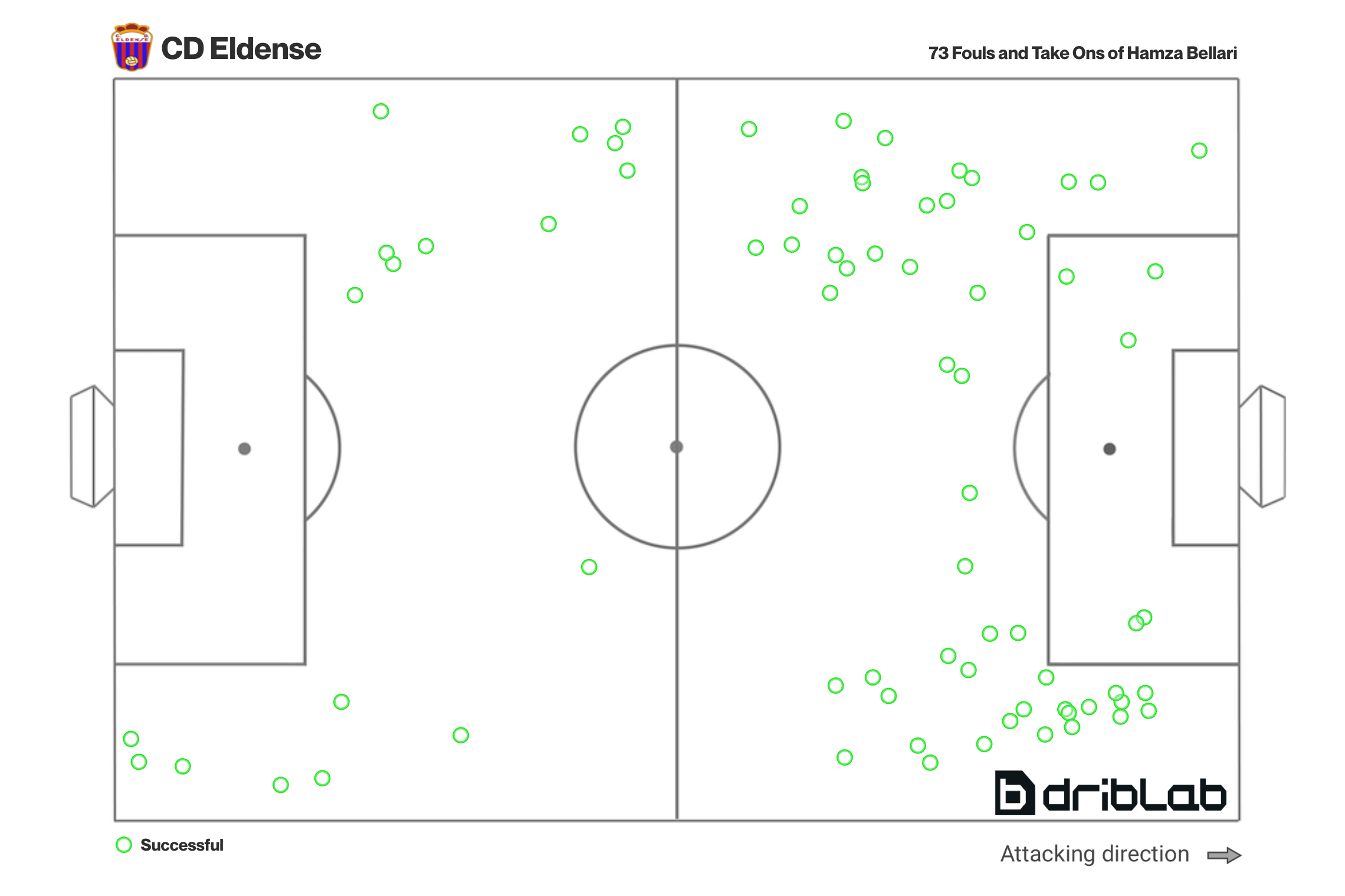 At Eldense, he's shown how good a dribbly winger he can be. His performances in individual-related metrics have been solid. Among 66 wingers and attacking mids with over 450 minutes played in Primera Federación, Bellari is fourth in successful dribbles per game (3.5) and second in fouls won per game (3.59).