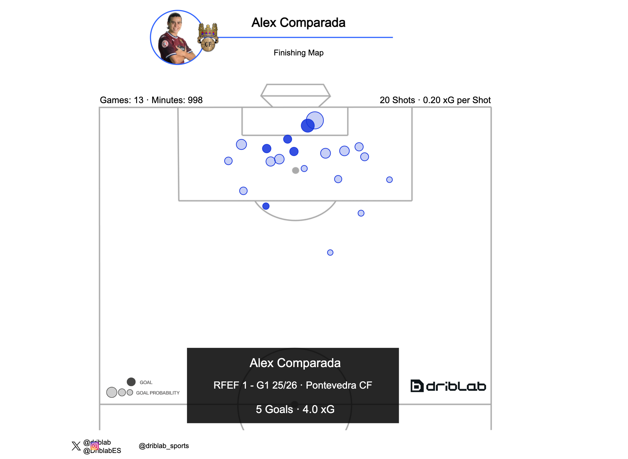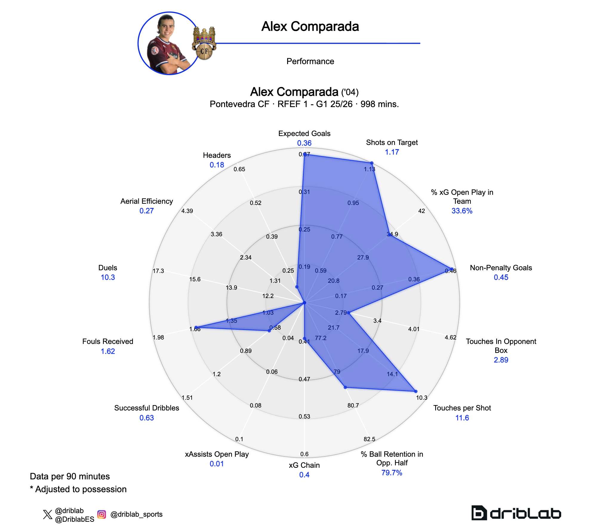 Despite his young age, responsibility does not weigh on him. Comparada is responsible for 33.6% of Pontevedra’s expected goals per game when he's on the field.