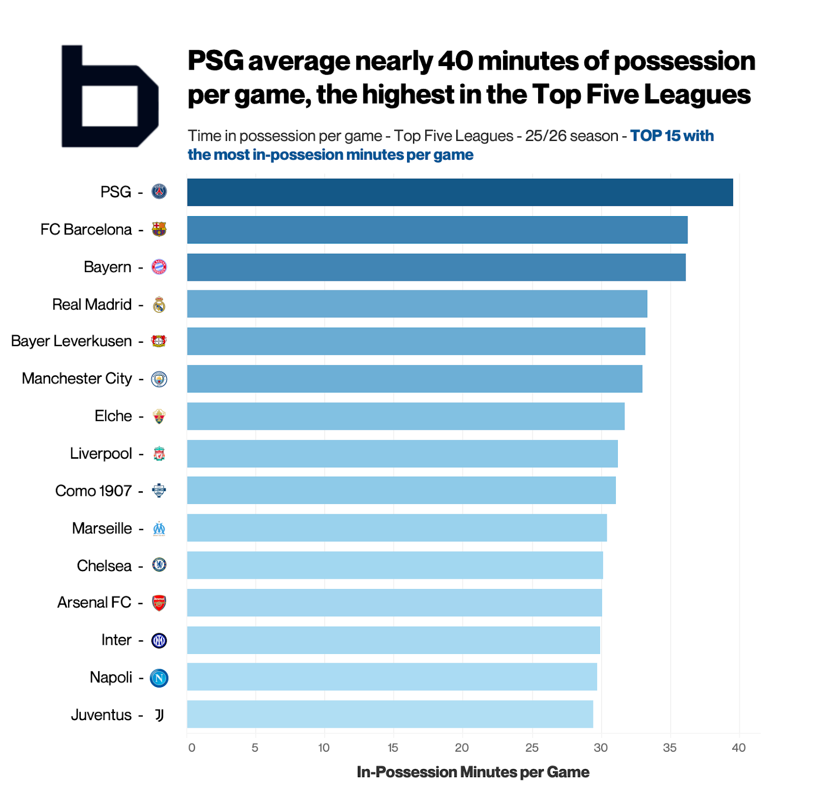 PSG's presence at the top is hardly a surprise. Luis Enrique's teams have always wanted the ball at all costs. We could pick countless metrics to prove this. But we'll settle for one: no team in the top five leagues has completed more possessions of 10 or more passes than PSG (641). FC Barcelona have completed 600, the 2nd most.