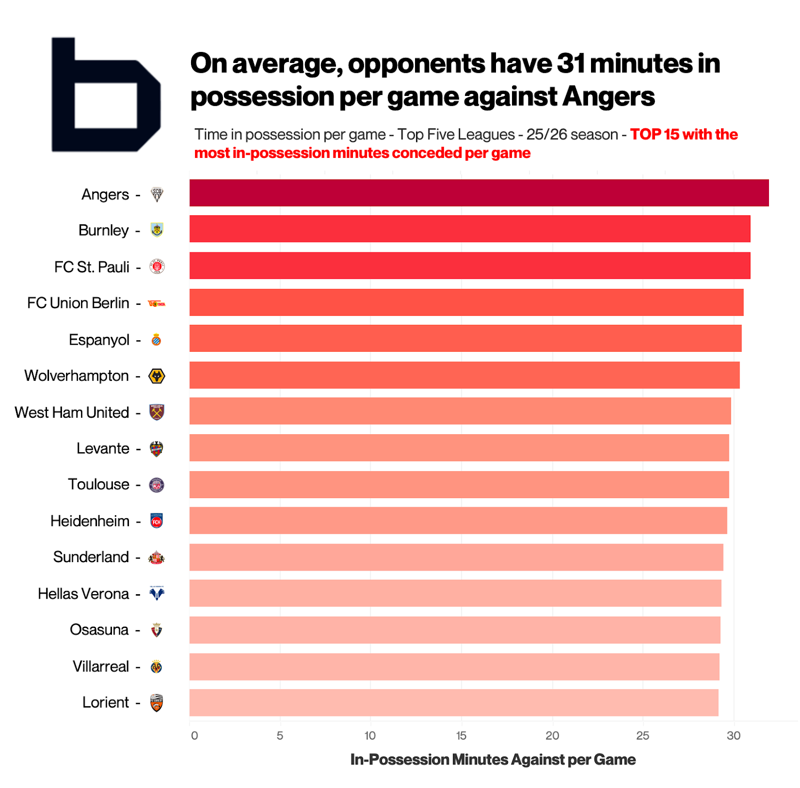 Whether by choice or forced by their opponents, most of the teams that concede the most possession time to their rivals are relegation-threatened sides. 8 of the 15 in the list occupy one of the bottom five places in their respective leagues.