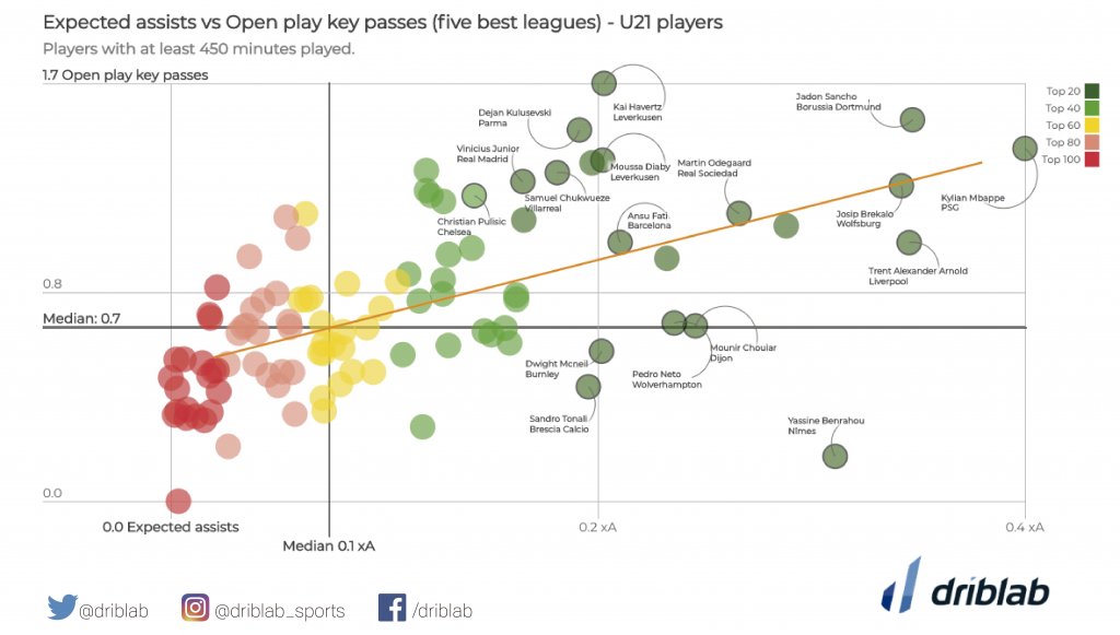 In the comparison with the rest of the U21 profiles of the five big leagues we see how Jadon Sancho does not distance himself so much from the rest of the names but continues as one of the outstanding names. In fact, if we look for a similar performance in both finishing and creating chances, the name that most closely resembles him is Christian Pulisic, the player that lost his place because of Sancho's growth at Dortmund. In the following graphic we compare Sancho's production in open play key passes and expected assists with the rest of U21 players in the big five leagues including all positions. Only Kylian Mbappe comes close to his numbers without being the set piece taker.