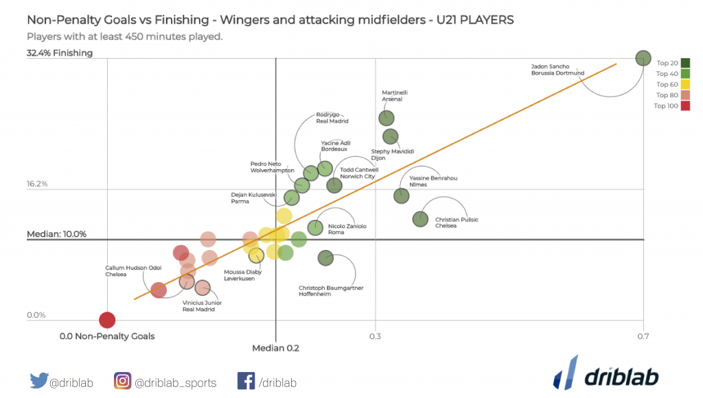 If it's already atypical to see one winger as one of the most efficient profiles in front of goal if that profile is a 19-year-old this is really difficult to see and it is worth stopping to analyze him. In fact, his figures continue to progress and make it clear that we're looking at a decisive player. So, to put this profile into perspective, the comparison is even more striking when you look at these figures against the other wingers and attacking midfielders in big five leagues with a maximum age of 21. The figures make it clear: Jadon Sancho is currently the best finisher of his position among the players of his generation. The difference between Jadon and the majority of his age and position profiles shows a totally different reality: Sancho scores almost a third of his shots and generates 0.7 non-penalty goals per 90 minutes.