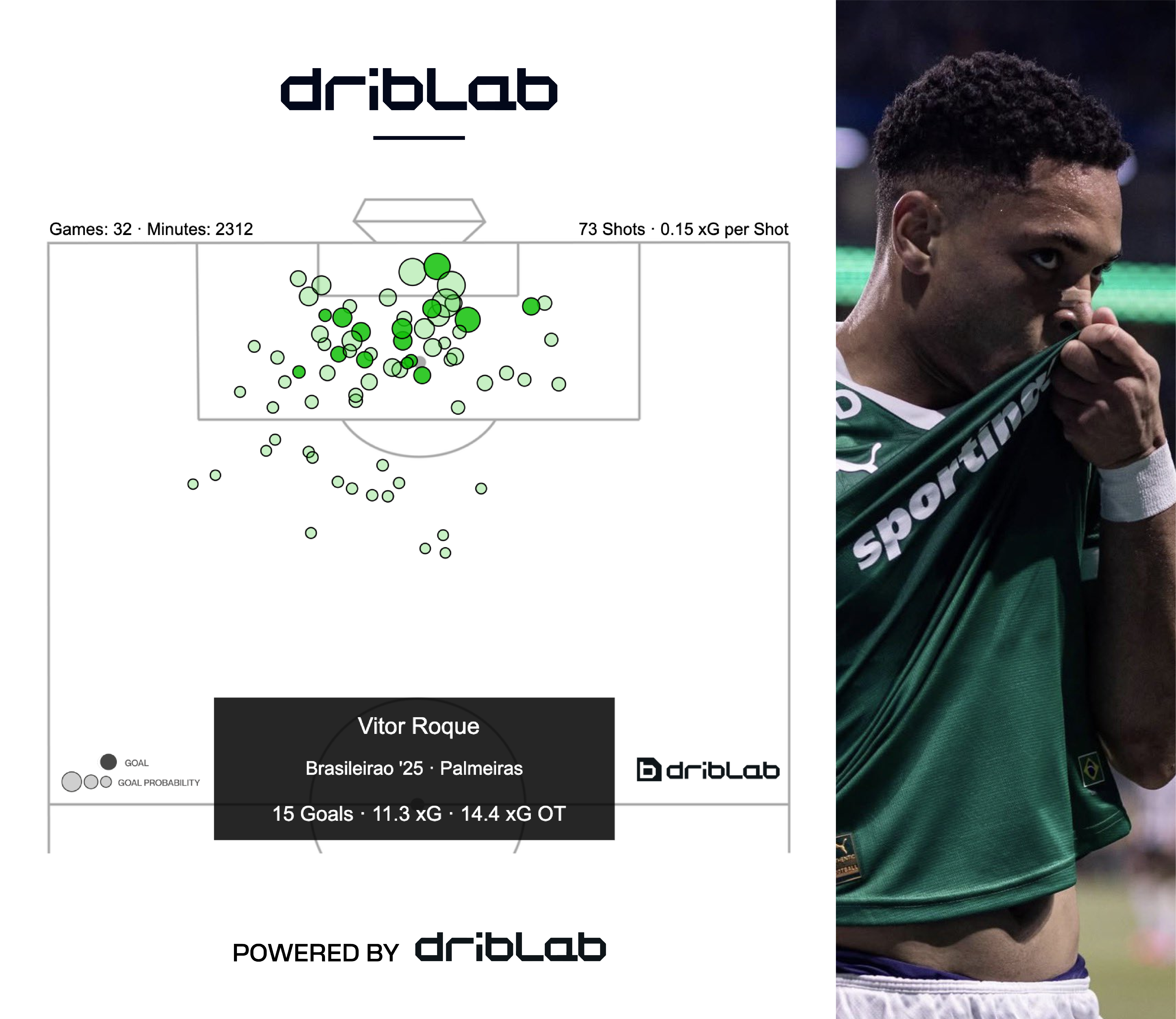 Among all strikers in the Brasileiro, Roque averages the second-highest number of touches in the box per match (6.03), and only five forwards shoot more frequently (2.76 shots). Fifty-two percent of his shots hit the target, and one in every five becomes a goal.