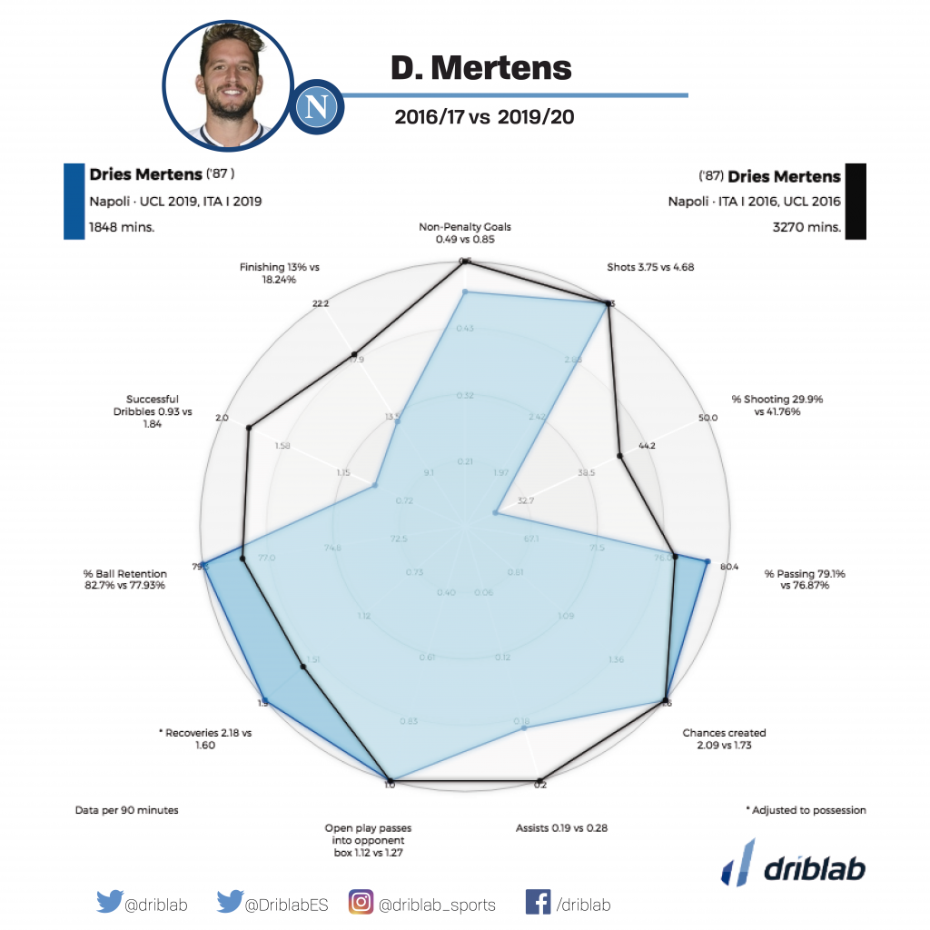 The first year as a striker (2016/17) marked a turning point in the Belgian's career. Since then his evolution has been directed to a greater security with the ball, less losses, better figures with retention of the possession, more success in passing and more chances created. Although Mertens is not the prototype of '9' he has always led the team in terms of expected goals and number of shots but what is most surprising is his consistency in finishing: except in 17/18, he has always scored above expected (Goals per xG greater than 1) and has shown great consistency in number of shots and finishing being above the average of his position.