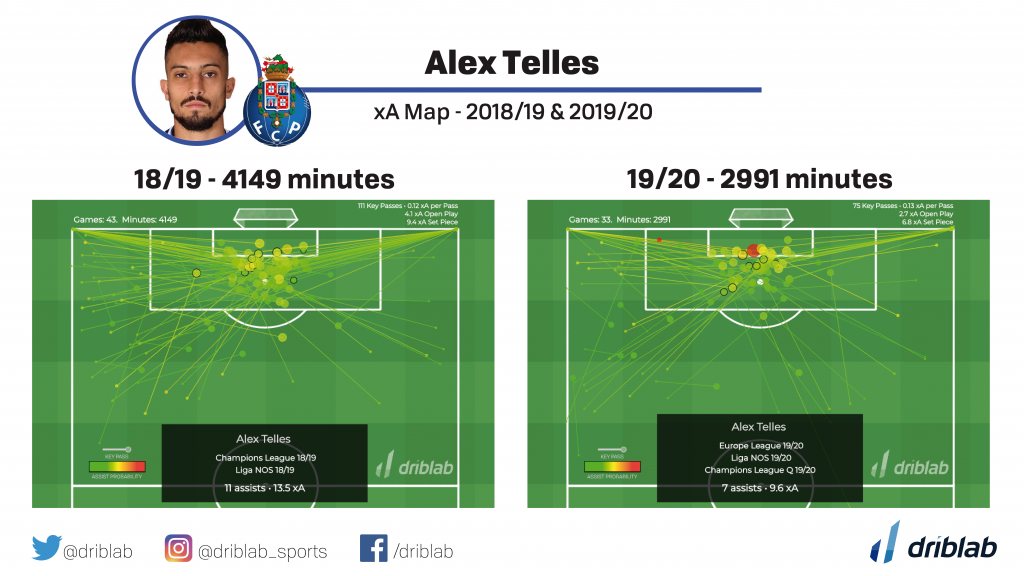 . Below you can see the xA maps of Telles in the last two seasons. As we say, his production is huge.