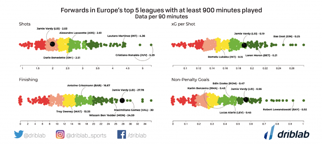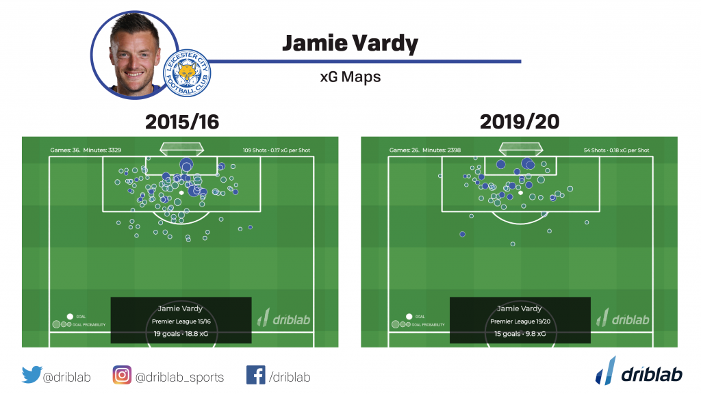 It's really strange that Vardy's shot volume is so low considering that the Leicester is producing a lot in attack. The Foxes have generated 1.95 expected goals per match this season. Even so, the Sheffield-born striker was leading the race to be the Premier League's top scorer before the coronavirus outbreak stopped the competitions. At 33 and having played just 2,398 minutes, he had accumulated 19 goals, coming close to the amount (24) he scored the season the team won the league title.