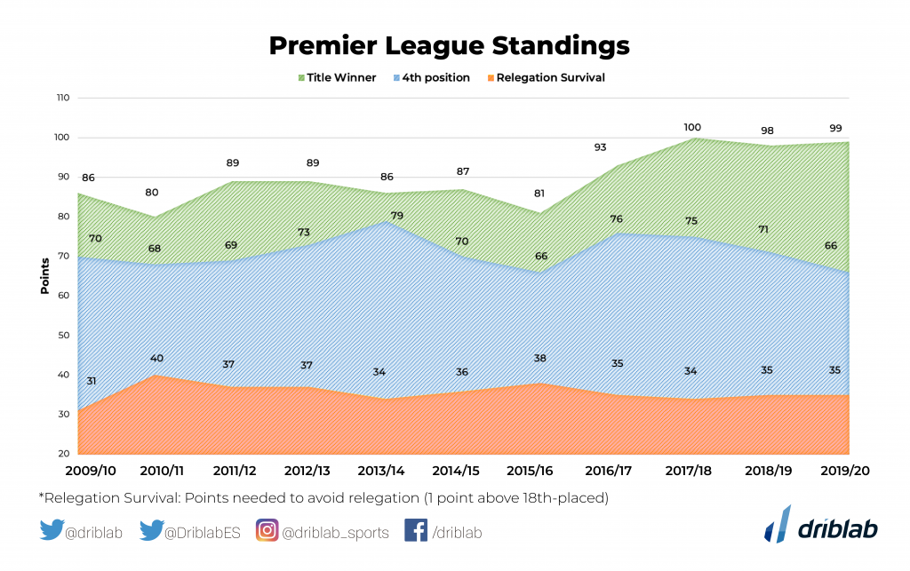 As a clear parallel, the last three years in the Premier League, characterized by the incredible competitiveness between Liverpool and Manchester City, back up this theory.  The data sharply reveals how the gap with respect to the rest of title contenders and the bottom table has reached its maximum in these 3 last years (33 and 64 points respectively, being 69% and 25% above the average).