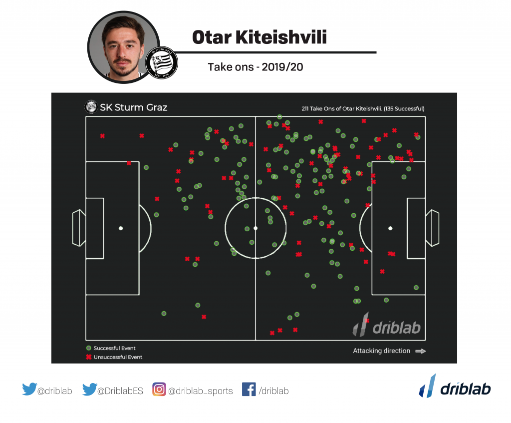 success ratioin this type of action. It should be noted that, despite his size, Kiteishvili's a player who is capable of adding in the defensive aspect. His figures in tackles are striking, both in terms of volume and effectiveness (83%).