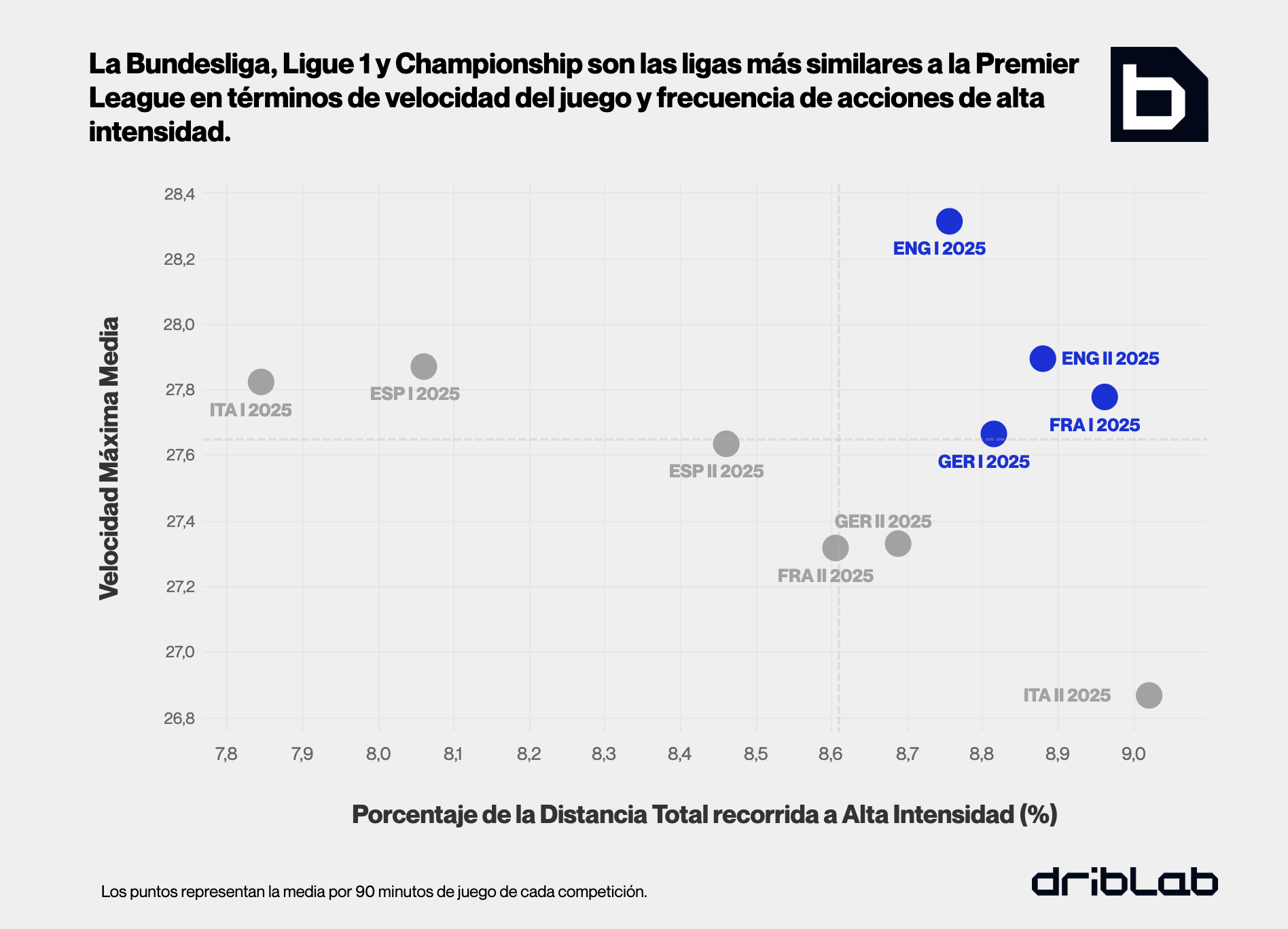 La Bundesliga, la Ligue 1 y la Championship son, junto a la Premier League, las ligas en las que más se repiten los esfuerzos de alta intensidad y en las que los futbolistas se mueven a mayor velocidad. Estas similitudes nos permiten predecir que, de media, el tiempo de adaptación a la Premier League será menor en comparación con futbolistas de otras competiciones.