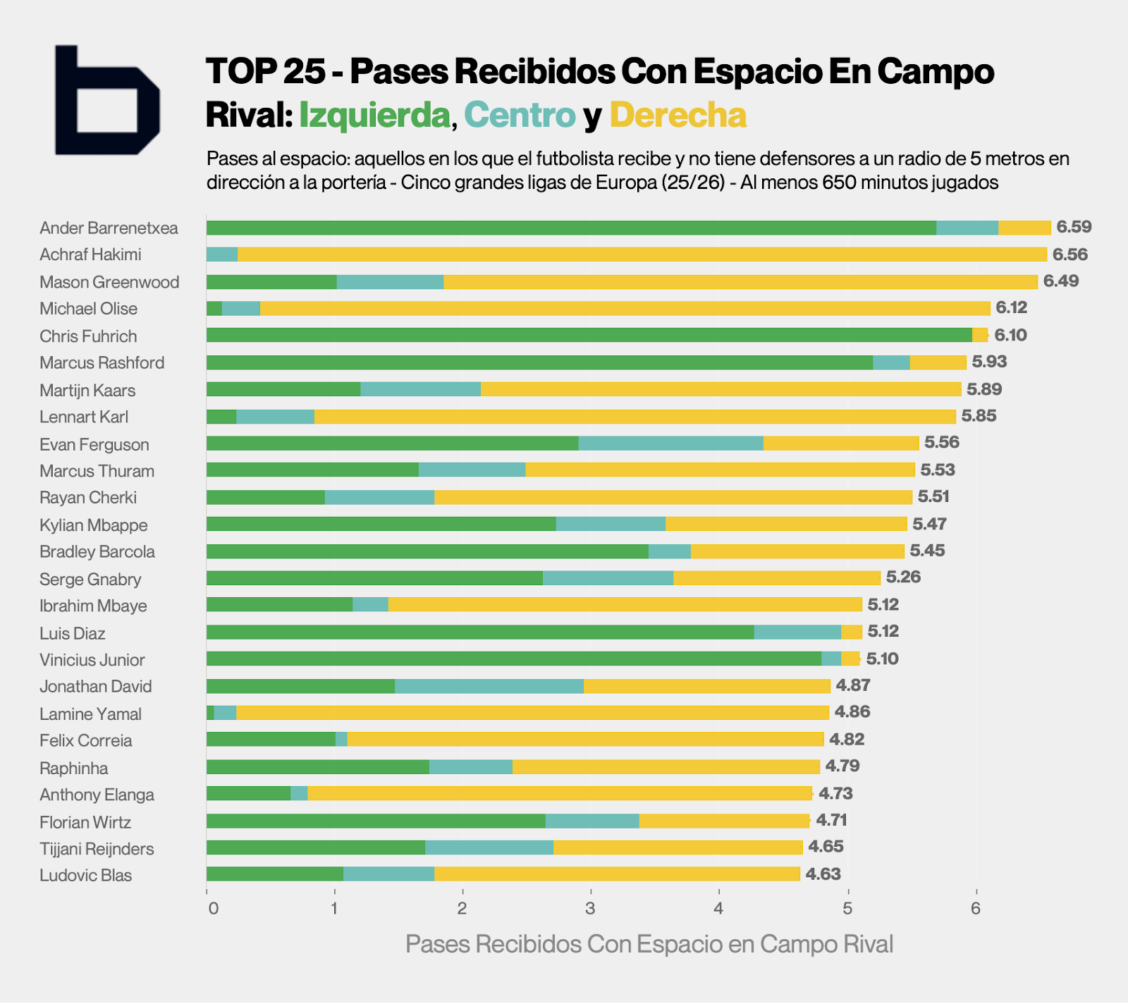 El primer nombre es el de Ander Barrenetxea. El extremo diestro que juega por la izquierda en la Real Sociedad es el futbolista que más pases recibe al espacio en campo rival en las cinco grandes ligas de Europa con 6.59 por partido. En términos totales suma 80, la novena cifra más alta, sólo por detrás de nombres como Kylian Mbappé, Mason Greenwood, Vinicius Junior o Luis Díaz.