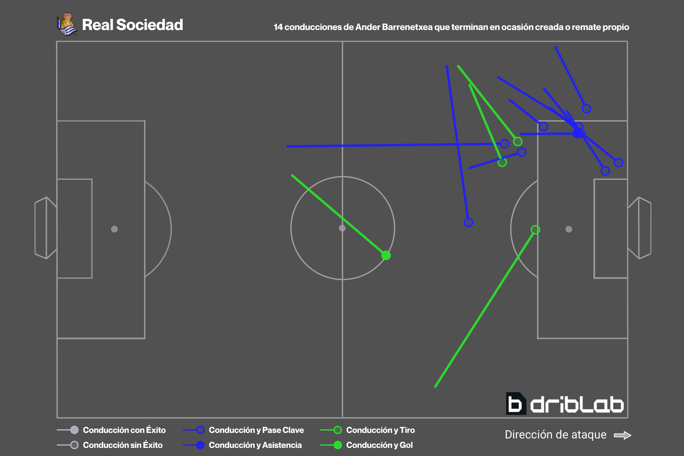 El vasco es la principal referencia de una Real Sociedad en la que los extremos tienen mucha importancia. El equipo txuri urdin trabaja con balón para encontrar a Barrenetxea en situación de ventaja y que este pueda conducir con potencia, regatear y asistir o rematar.