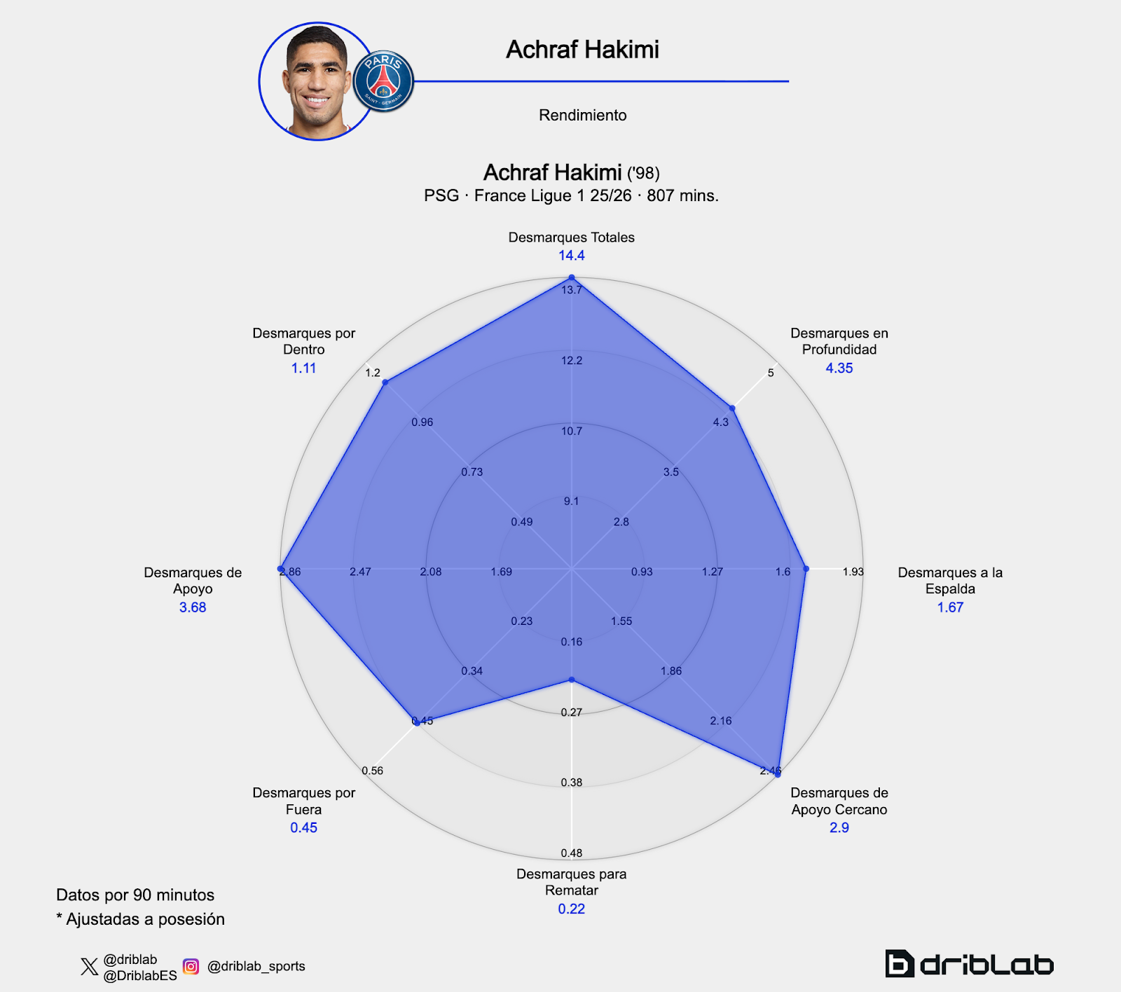 En cambio, el segundo futbolista que más pases recibe con espacio libre enfrente es Achraf Hakimi, uno muy diferente al primero. El marroquí es una de las armas ofensivas más diferenciales del PSG, a pesar de jugar en una posición teóricamente más retrasada en el campo como la de lateral derecho.