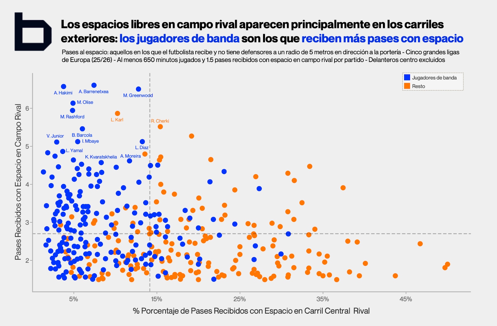 El marco de análisis que hemos creado para hoy nos permitirá saber quiénes son los futbolistas que más reciben pases con espacio libre en campo rival, en qué zonas y por qué.