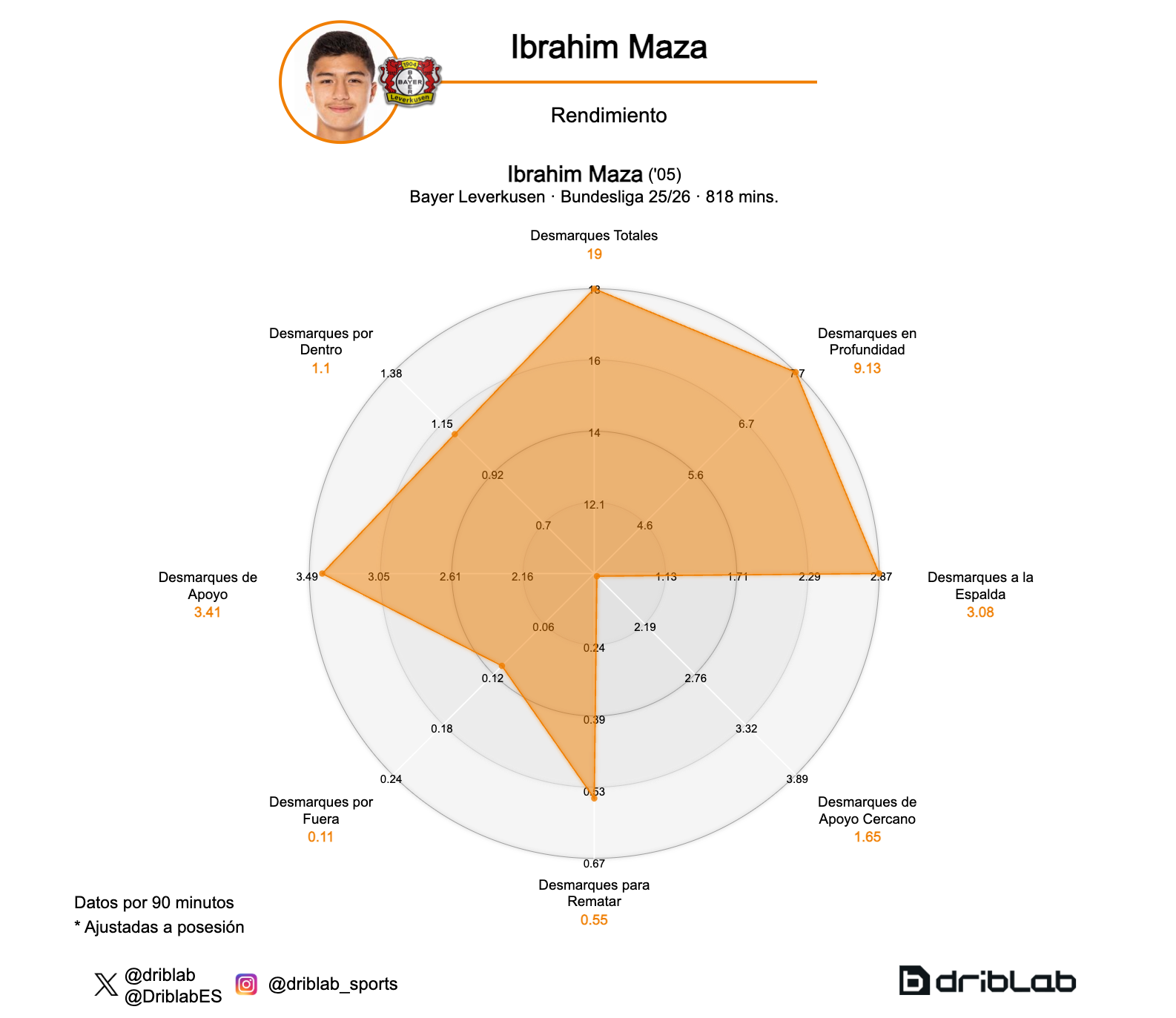 El contexto en el que estos jugadores pueden brillar lo marcan sus equipos. El Leverkusen es el quinto equipo que más pases que rompen la línea de mediocentros rivales promedia por partido (36.3), por lo que nos creemos que Ibrahim Maza sea uno de los futbolistas que más veces reciben con espacio en el carril central rival.