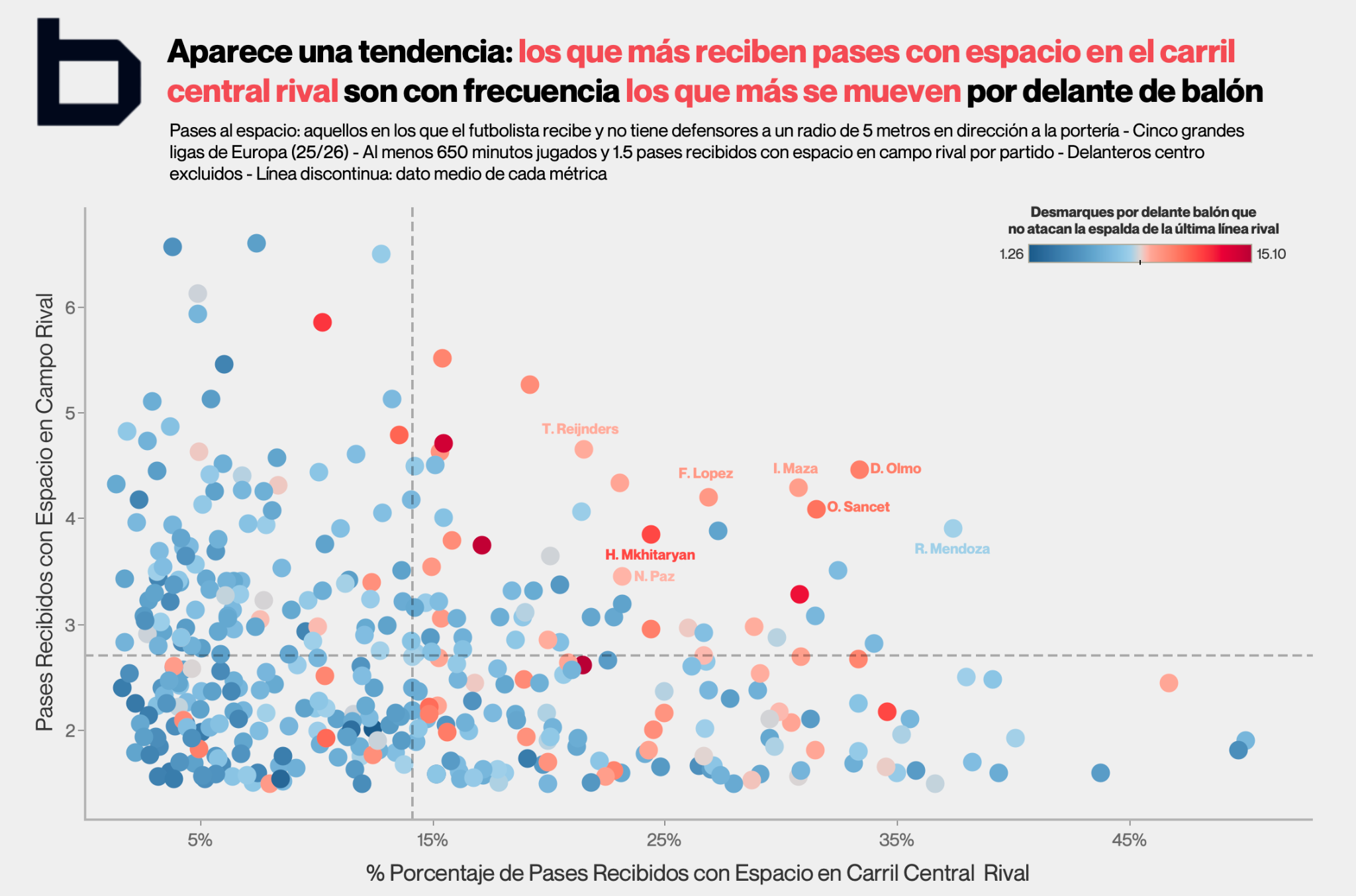Si recuperamos el gráfico y le añadimos color según la cantidad de desmarques en profundidad promediada por partido, podemos observar que aquellos que más se mueven son los que más terminan recibiendo por el carril central rival. Es una tendencia, a pesar de que haya excepciones como la de Rodrigo Mendoza, que recibe mucho por dentro pero no se mueve más que la media.