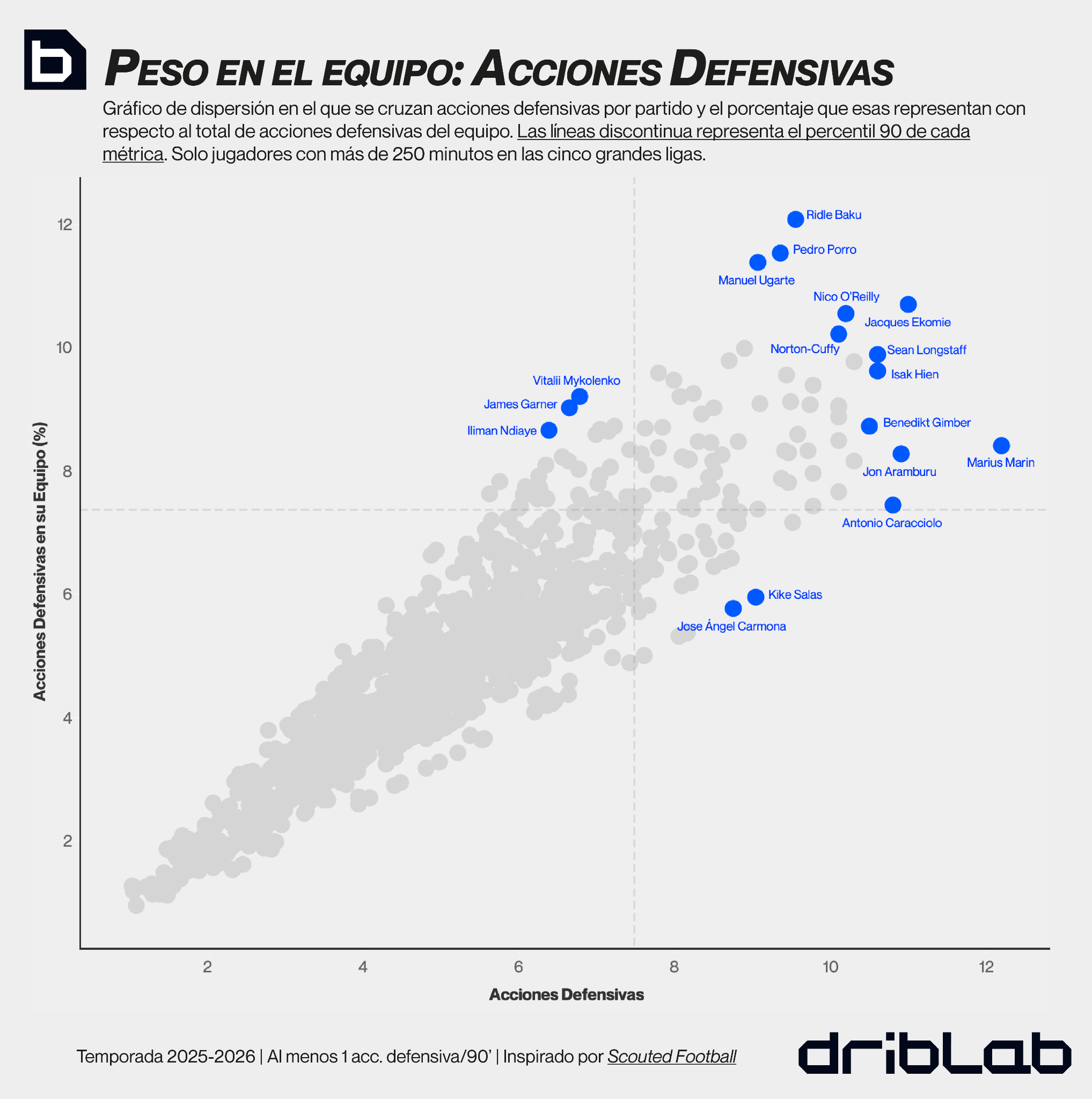 Empezamos con la métrica de acciones defensivas, que Driblab define como la suma de tackles, intercepciones, bloqueos, faltas comedias y duelos individuales).