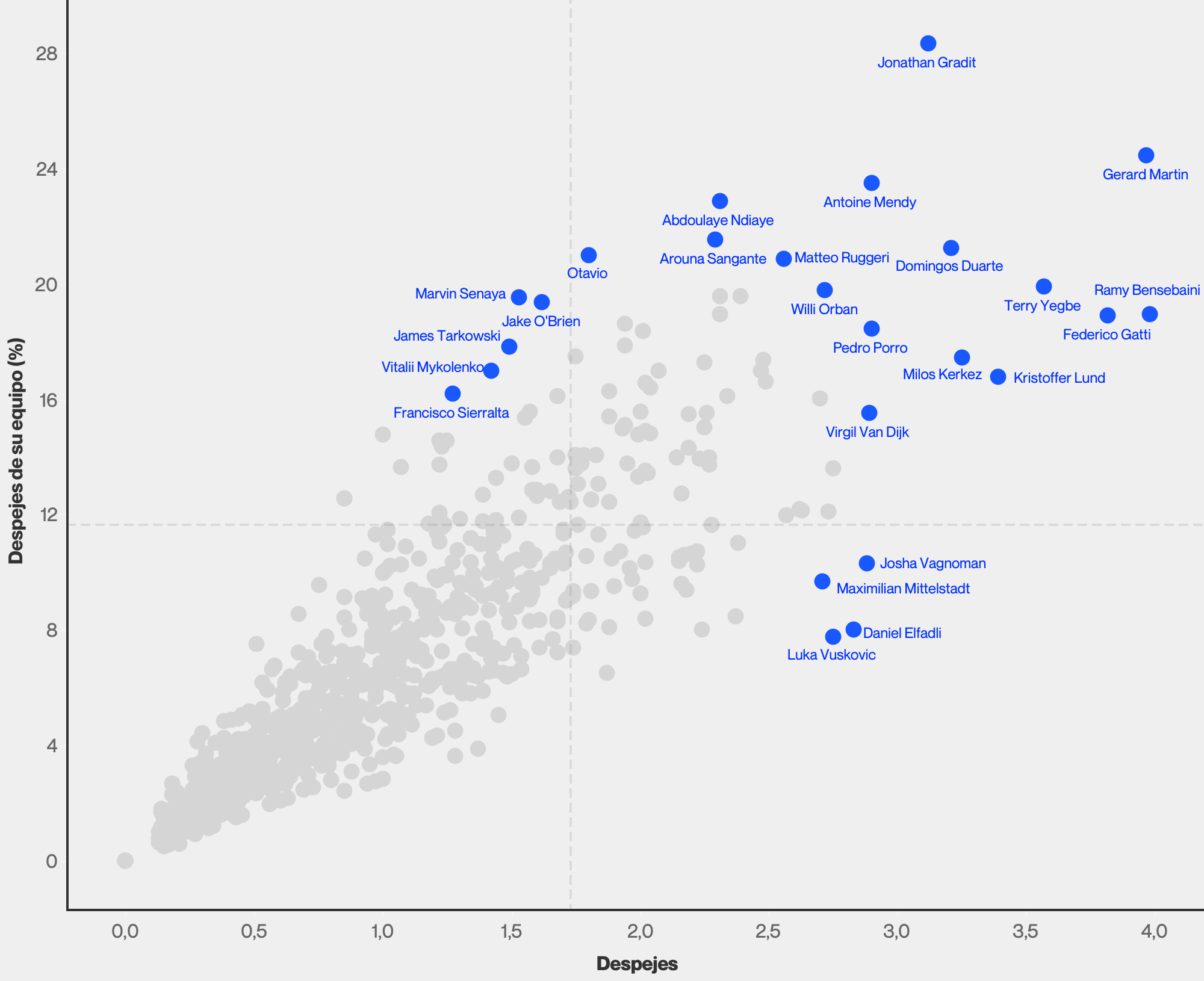 Uno de los que supera su volumen, pero no su peso respectivo en el equipo, es Gerard Martín. El lateral español del FC Barcelona ha despejado el balón en 16 ocasiones. En su equipo, solo Eric García le supera con 17. Sin embargo, Eric García ha jugado casi el doble de minutos que Martín, por lo que las cifras de este último son más impactantes aún. Se hace cargo del 24.43% de los despejes del FC Barcelona, que es el equipo de las cinco grandes ligas que más despejes hace por partido (15.64). Algo que está muy ligado a su manera de defender tan atrevida, que conlleva que el equipo reciba un gran número de pases que necesitan ser despejados porque buscan atacar la espalda de la línea defensiva.