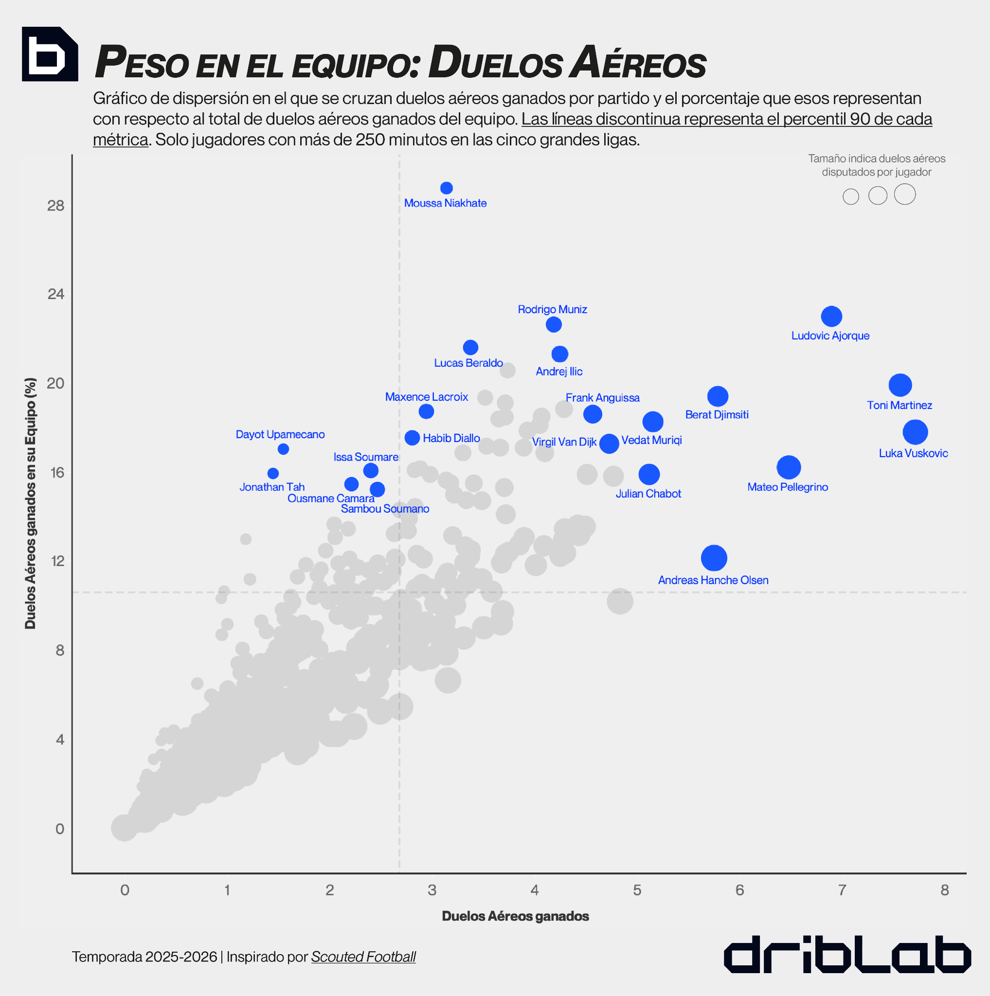 El central croata promedia 7.7 duelos aéreos ganados de cada 10 disputados. Nadie gana más duelos aéreos por partido que Vuskovic. En términos de responsabilidad también está en el 10% superior. Se hace cargo del 17% de los duelos aéreos ganados del Hamburgo.