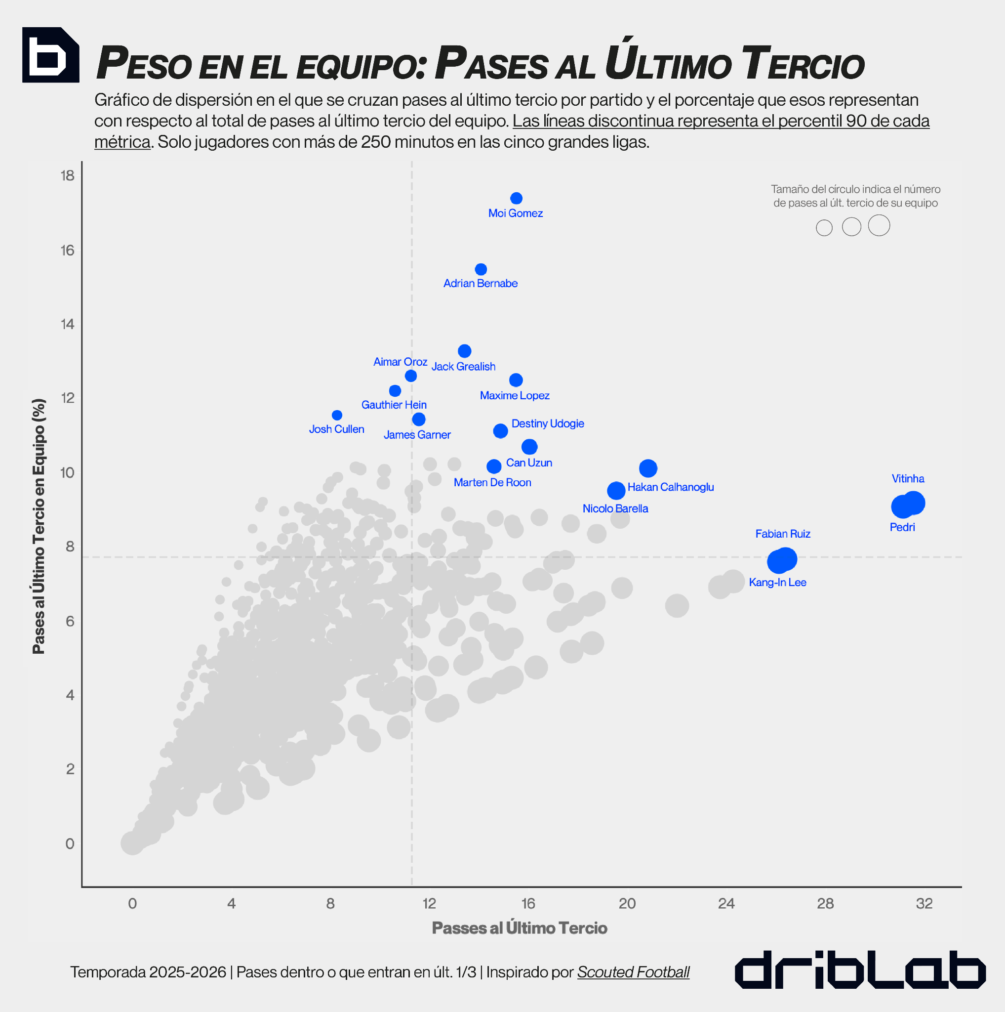 Muy alejados del resto en términos de cantidad están Pedri y Vitinha, que juegan en los dos equipos que más pases al último tercio están promediando.