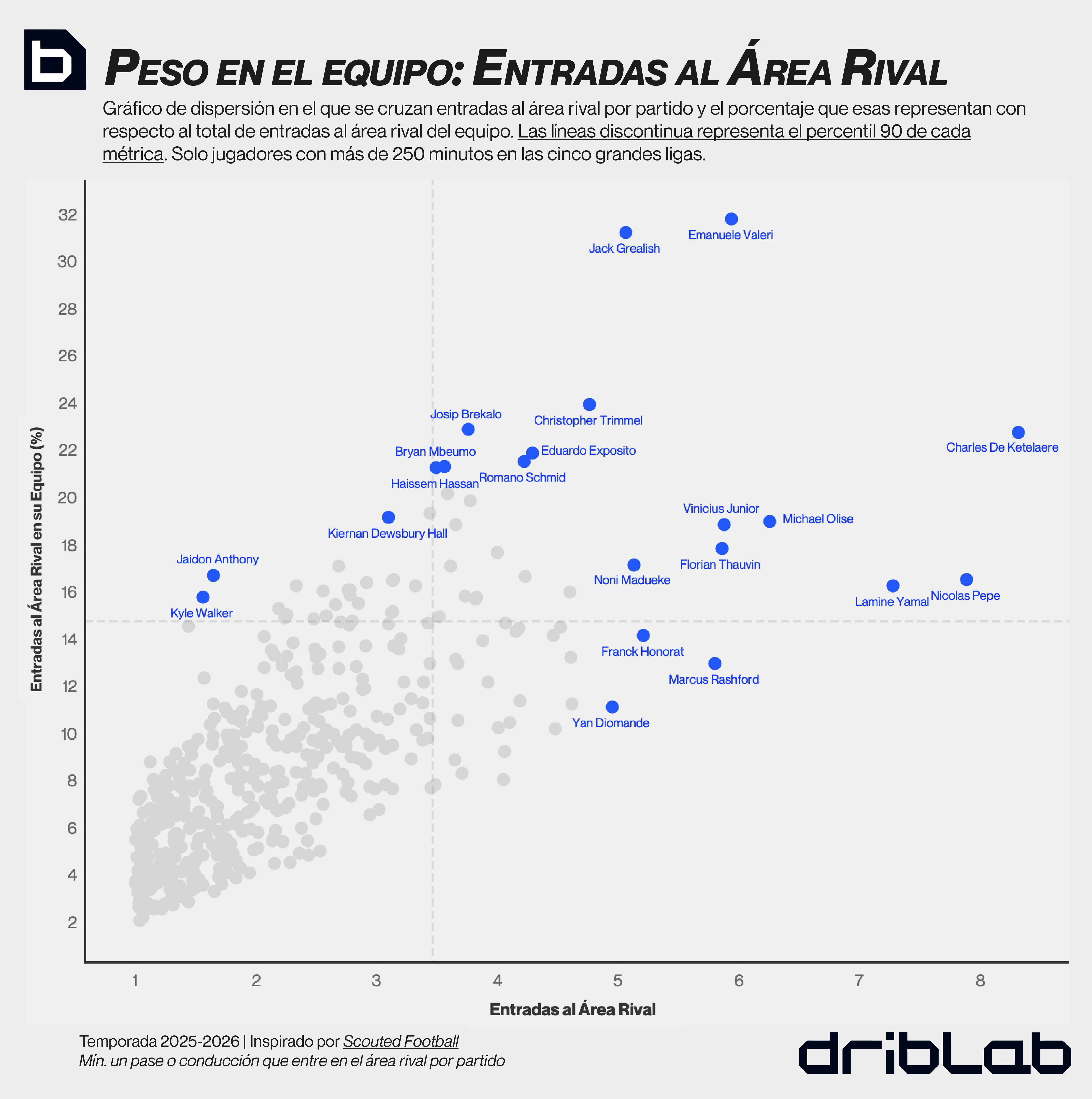 Sin embargo, en esta métrica es más interesante destacar a los futbolistas que consiguen llevar el balón al último tercio en aquellos equipos que menos posibilidades tienen de hacerlo.