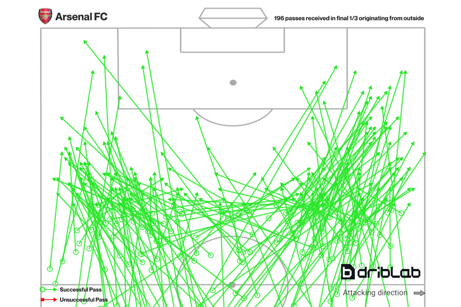 Viendo el mapa de pases al último tercio del Arsenal esta temporada (solo aquellos que se originan en zonas más atrasadas) comprobamos que el Arsenal ha echado en falta un futbolista que reciba entre líneas y en el carril central.