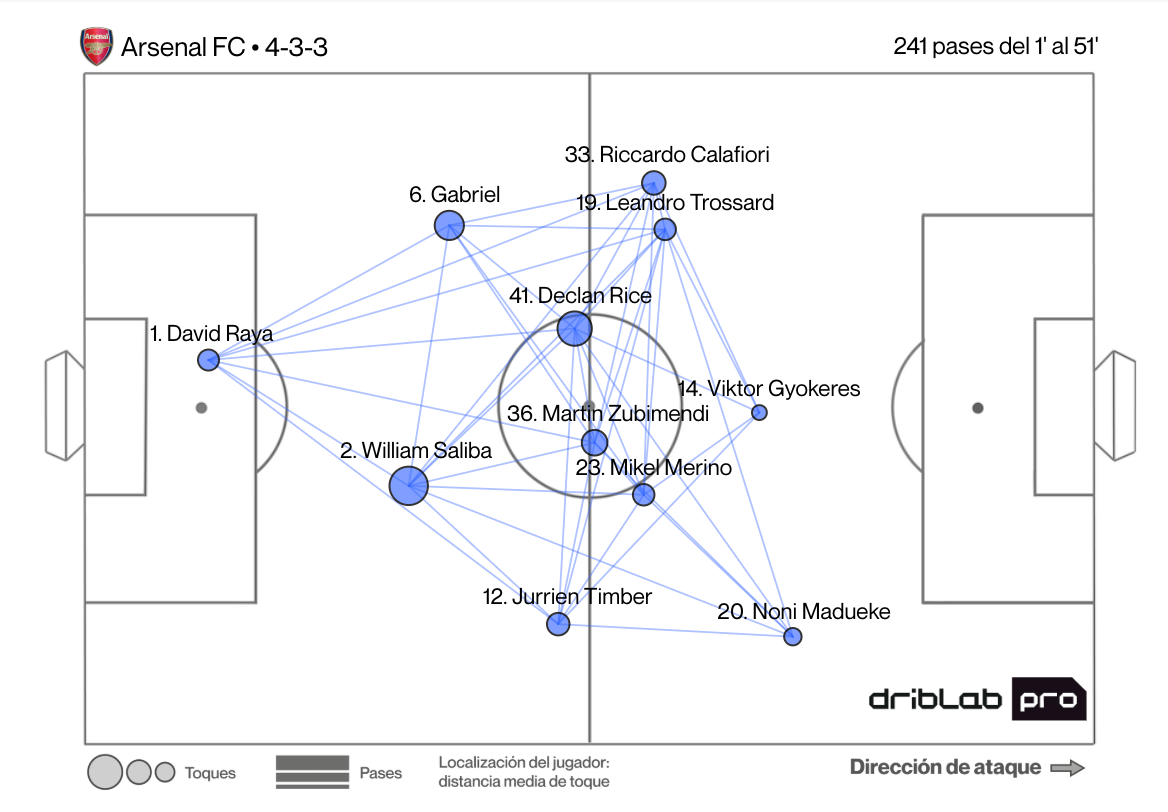 El equipo de Pep Guardiola, siendo compacto entre líneas y defendiendo más cerca de su portería, consiguió alejar y desconectar a Gyokeres y a Madueke del juego de su equipo. Convenientemente, que Rice, Zubimendi y Merino aparezcan en nuestros mapa de pases prácticamente en la misma línea vertical nos muestra lo mucho que el Arsenal echó en falta algún elemento creativo entre líneas y por delante de los mediocampistas durante los primeros 51 minutos de partido para conectar con los atacantes.