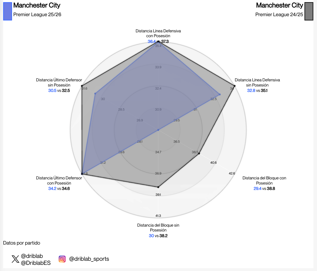 Sigue promediando un porcentaje alto de posesión (50%), pero más bajo que el del año pasado (60%), lo que podría implicar que Guardiola esté aceptando que sus rivales tengan más el balón y en zonas más altas para que se expongan y se abran los espacios tanto entre líneas como a espaldas.
