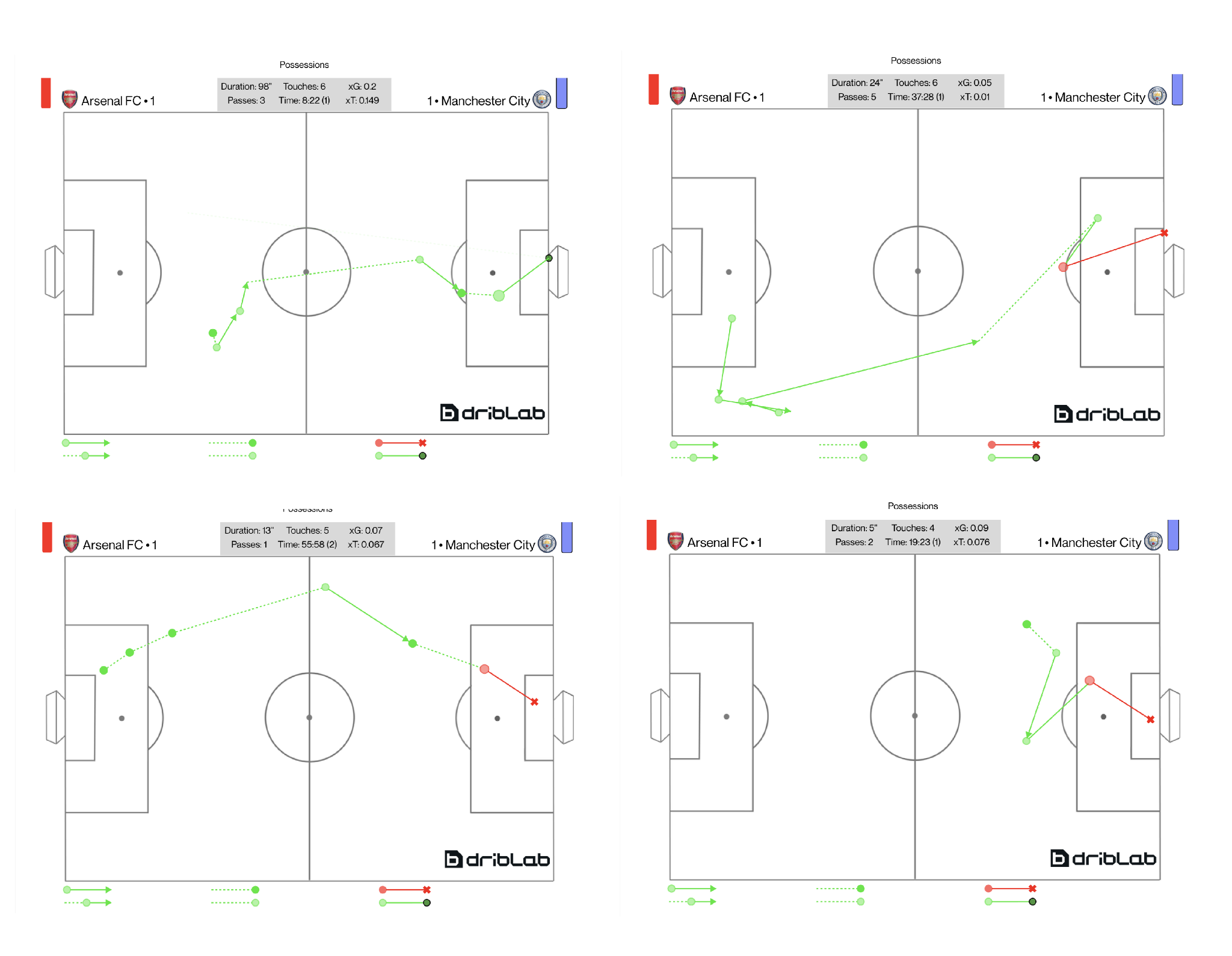 Avanzar más rápido suele ir de la mano con promediar menos pases por secuencia. Si nos fijamos en los cuatro remates del Manchester City ante el Arsenal, ninguna de las cuatro secuencias supera los 5 pases.