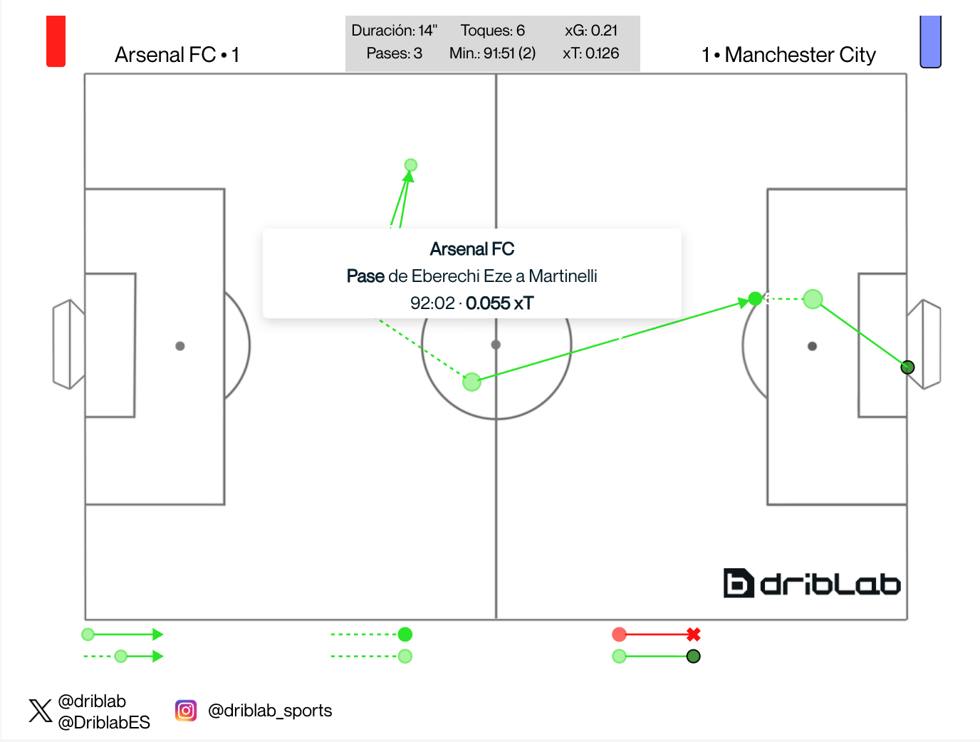 Sin embargo, el gol fue una buena muestra de lo positivo que hubiese sido para los gunners la constante aparición de un futbolista con velocidad de ejecución y verticalidad en el pase en zonas interiores. Con solo 23 pases, Eze se hizo cargo del 18% del xT (peligro esperado) del Arsenal durante el partido. Un pase picado suyo, que superó la línea defensiva del Man. City, fue lo que necesitó el Arsenal para empatar.