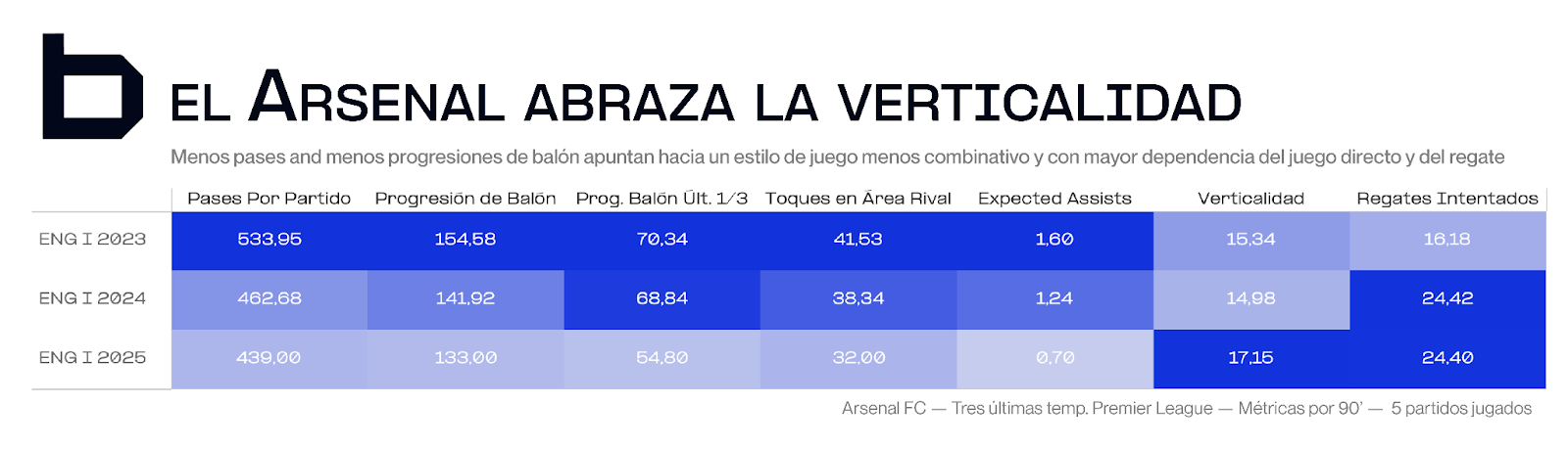 Los cinco primeros partidos de esta temporada ya muestran indicios fiables de esta transición hacia un juego menos combinativo y más vertical que está comenzando el Arsenal.
