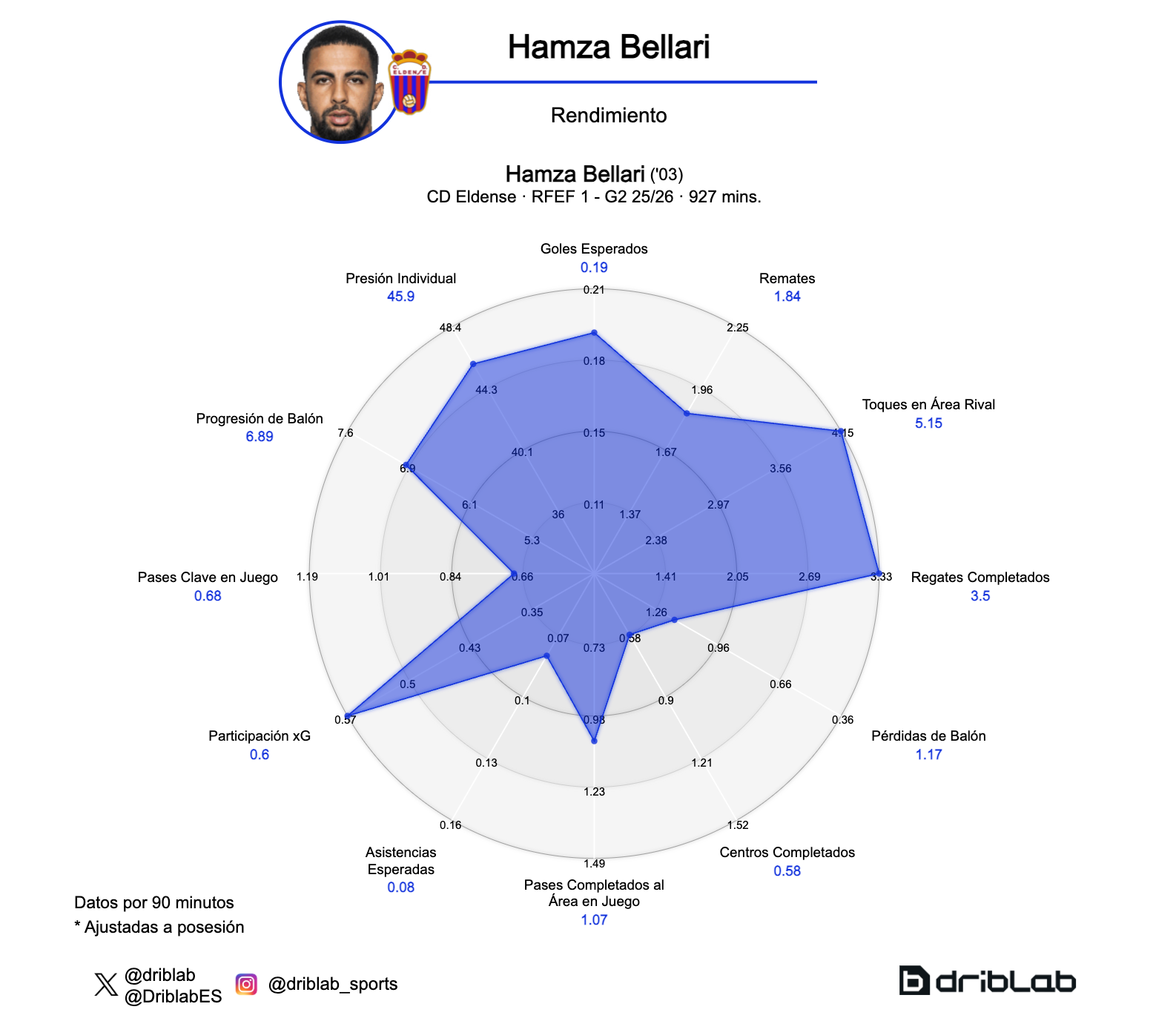 En el Eldense está demostrando ser un regateador con rendimientos interesantes en aquellas métricas muy ligadas a lo individual: entre los 66 extremos y mediapuntas con más de 450 minutos en Primera Federación (ambos grupos), Bellari es el 4º futbolista que más regates completa por partido (3.5) y el 2º que más faltas recibe con 3.59 faltas ganadas por partido. Siempre es importante que un regateador, además de tener la habilidad de superar rivales, tenga la capacidad de ganar faltas para su equipo.