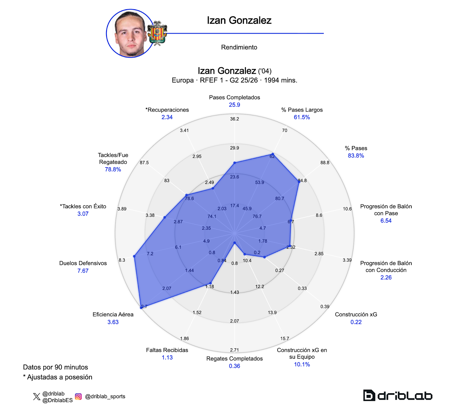 Izan tiene un perfil de mediocentro bastante completo. Es un futbolista seguro con balón, en el 86% de las veces que tiene el balón no lo pierde, pero también demuestra habilidad para ser progresivo. Sus 8.8 progresiones de balón entran dentro del 40% que más completan por partido. El 10.4% de las progresiones de su equipo las realiza él mismo, una cifra que está por encima de la media si se compara con los mediocentros de su grupo.