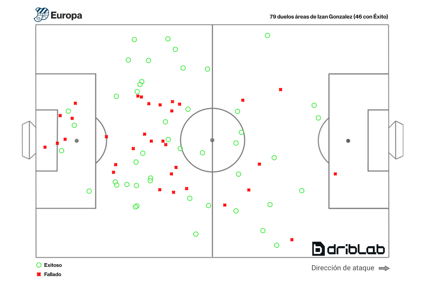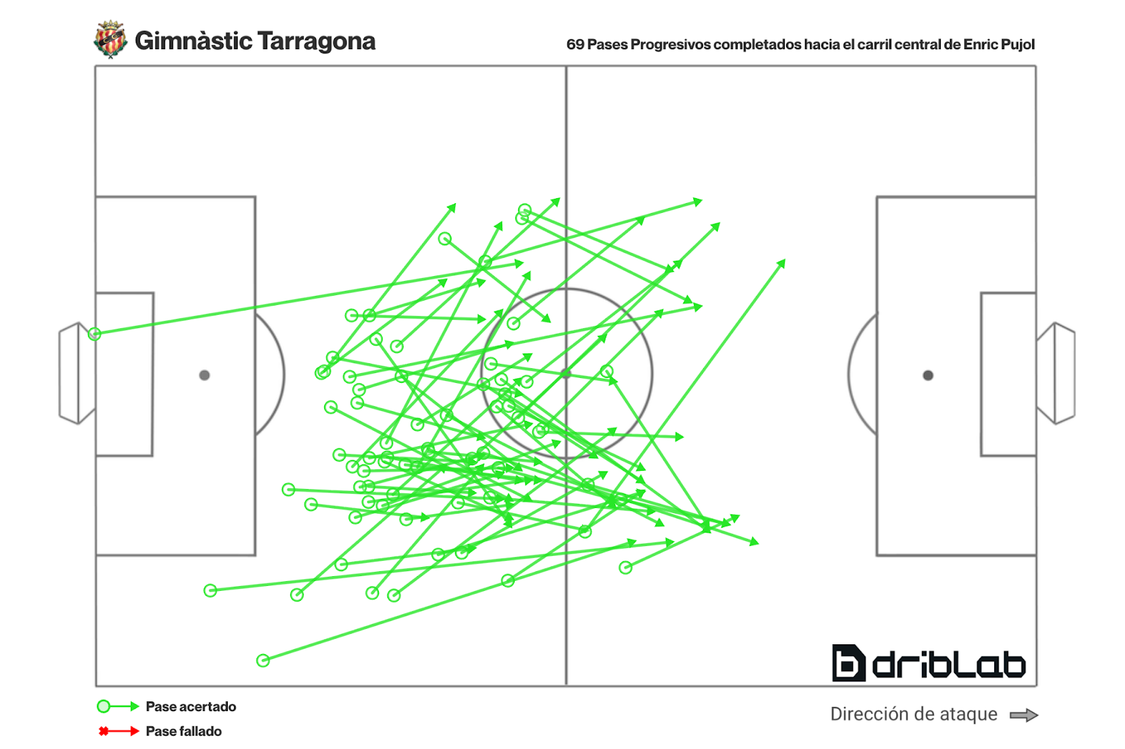 Lo interesante es que el 49% de las progresiones de balón que ha realizado con pases han sido dirigidas hacia el carril central, es decir, la que suele ser la zona más congestionada de un campo de fútbol.