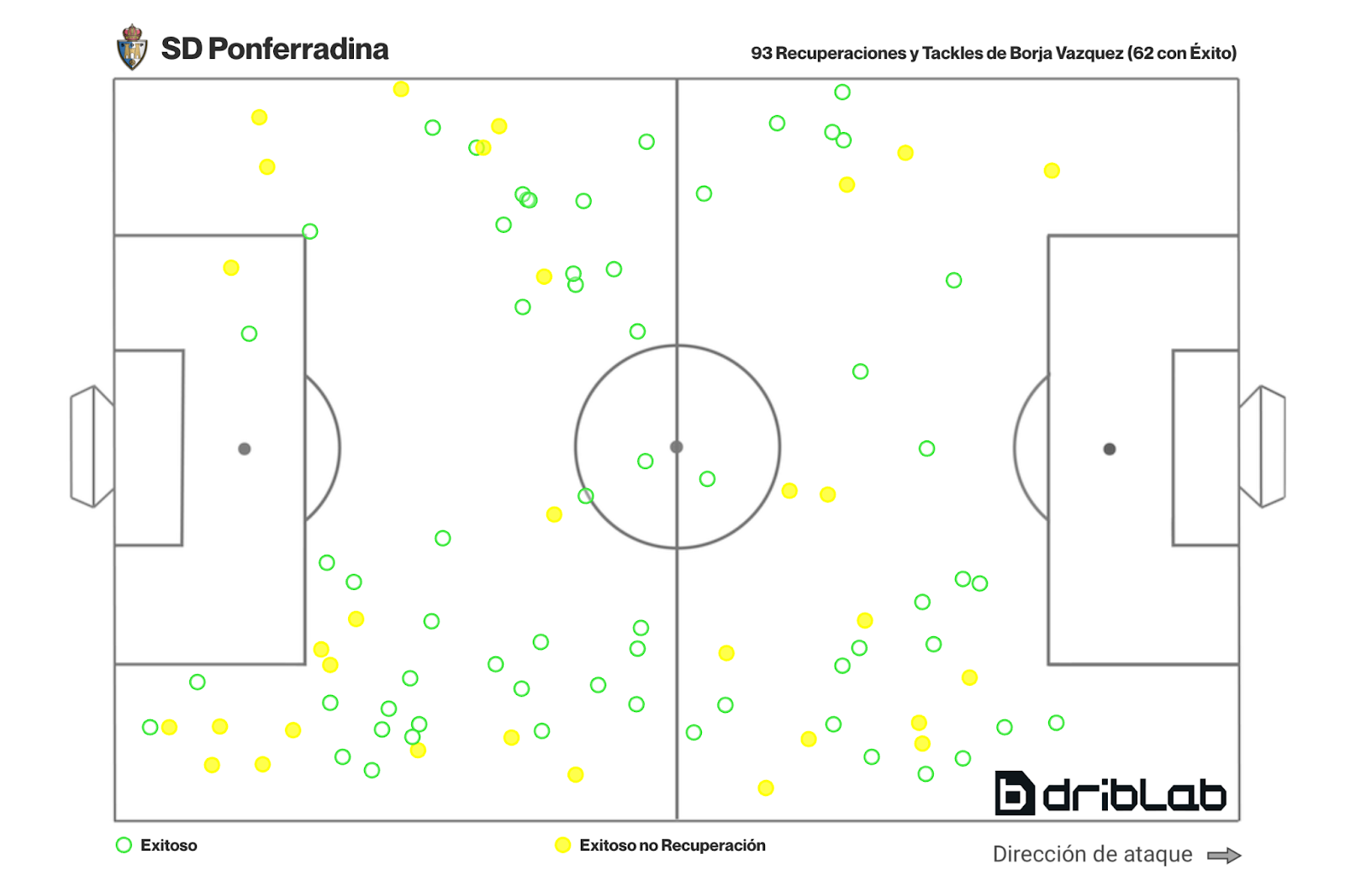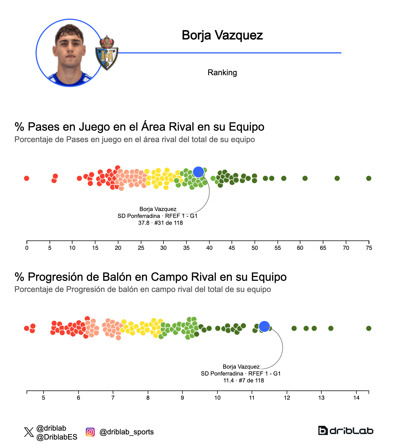 De igual manera, a pesar de no tener la influencia dentro del área que le gustaría, Borja Vázquez es muy importante para la Ponferradina. Se ocupa del 11.4% de las progresiones de balón en campo rival de la Ponferradina. Solo 6 jugadores de banda mejoran esta cifra en la Primera Federación. Además, cuando está en el campo realiza el 37.6% de los pases al área de su equipo. Otra cifra situada bastante por encima de la media.