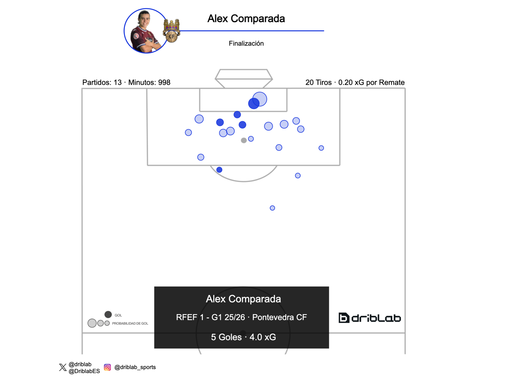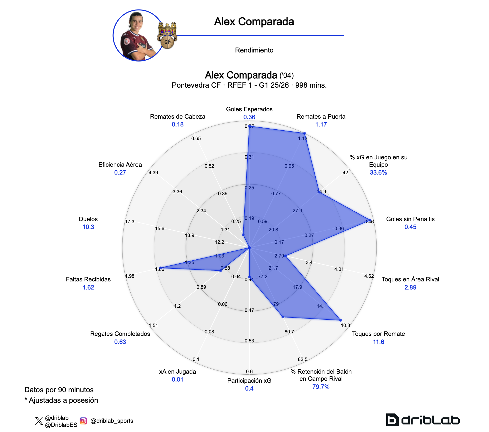 En comparación con otros delanteros, Comparada no destaca por volumen de remate, pero sí por su capacidad para generar ocasiones en contextos de poco servicio. Su cifra de 0,36 goles esperados por partido apunta a un delantero que, incluso en un Pontevedra en principio diseñado para la permanencia, encuentra situaciones de finalización con relativa facilidad: según sus cifras de xG, se espera que marque un gol cada tres partidos.
