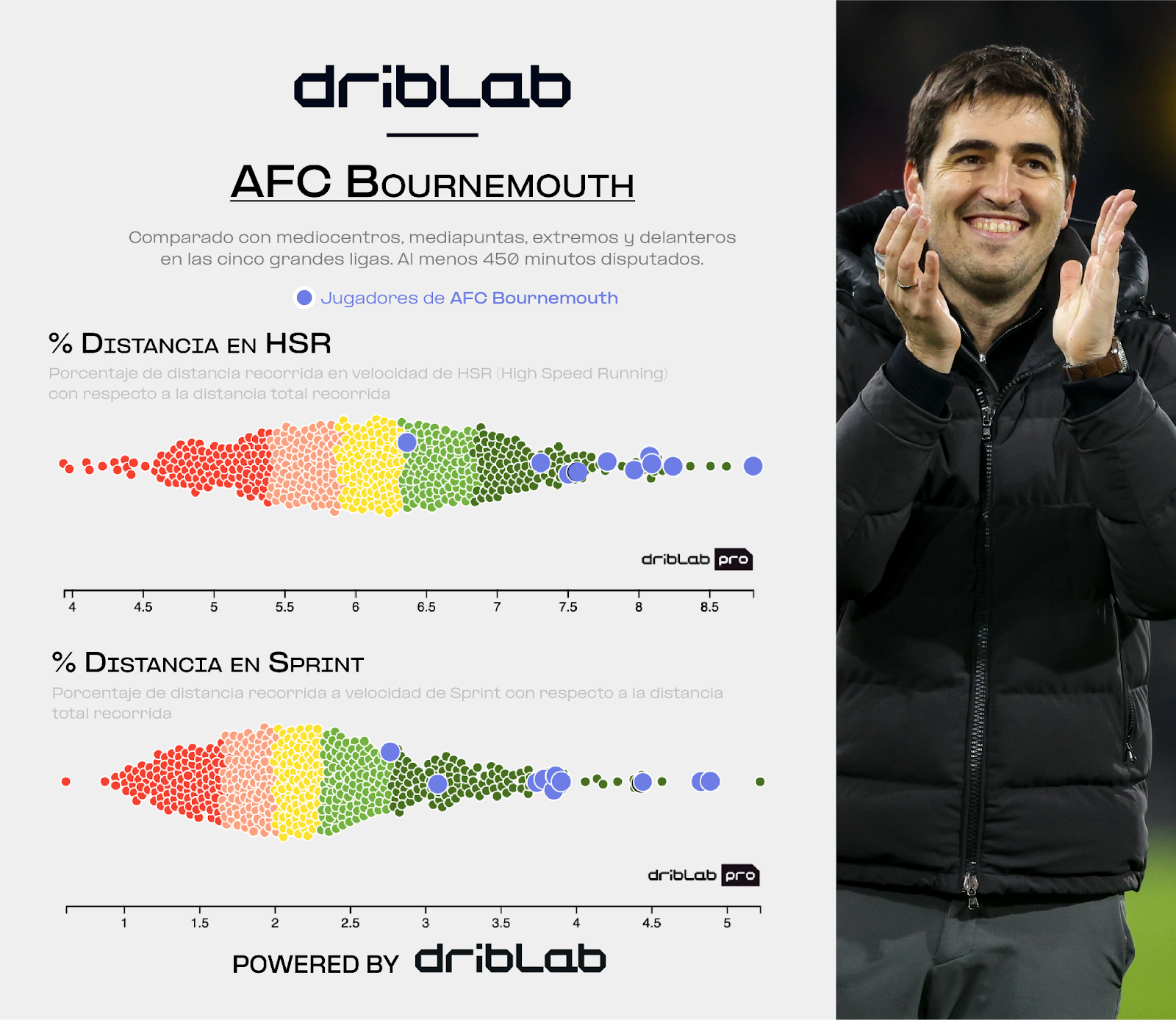 Si combinamos las cifras de todos los futbolistas con al menos 800 minutos disputados y que no sean porteros, todos los futbolistas que cumplen estas condiciones en el Bournemouth promedian un porcentaje de distancia a velocidad de sprint que está por encima de la media. 16 futbolistas tienen un porcentaje de distancia recorrida a sprint mayor 2.5%.