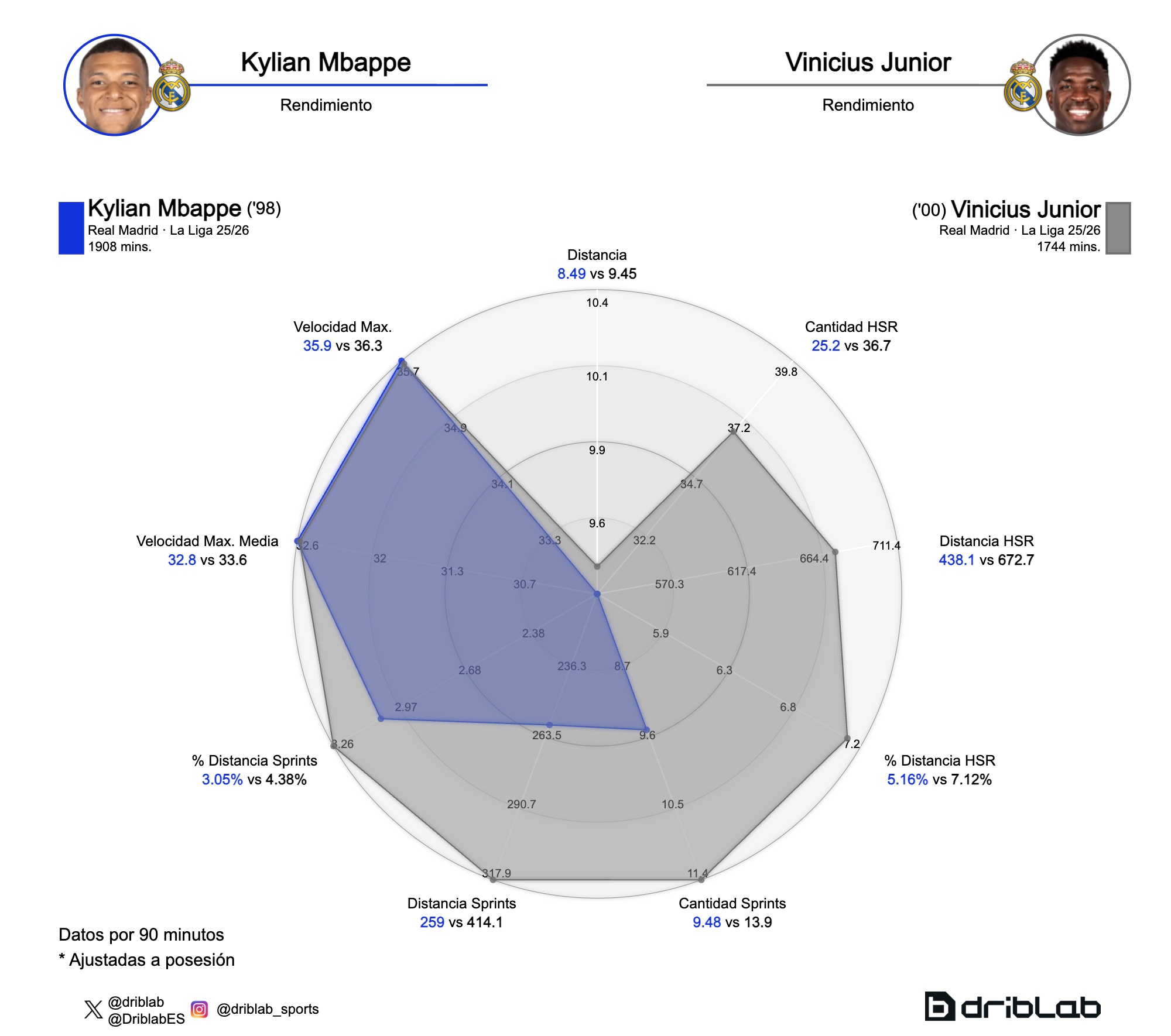 De la misma manera que Mbappé corre poco, también lo hace Vinicius Jr, aunque no tanto. Sin embargo, el astro brasileño realiza significativamente más sprints y más movimientos de alta intensidad que el francés y recorre más distancia a altas velocidades. Vini Jr. es el segundo extremo de LaLiga que mayor porcentaje de su distancia recorrida por partido realiza a velocidad de sprint y el quinto que más porcentaje recorre a velocidad de alta intensidad (entre los 17.8 km/h y los 25.2 km/h).