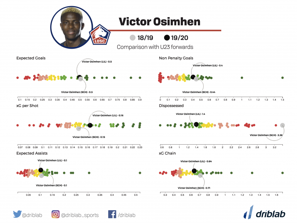 The growth of teams like Lille will depend on their success not only in terms of who to buy from but also when to sell. Last summer Victor Osimhen was signed after a great year at Charleroi, is it time to say goodbye? The young Nigerian's performance has not been affected by the change of league: if we compare his figures with the rest of the U-23 strikers in the big leagues, we see that he stands out as a player who generates expected goals but also assists and who has improved in aspects such as keeping possession or selecting his shots compared to last season. Osimhen is already being linked with big clubs and for Lille it could be a successful operation after signing him for 12 million. Time to go?