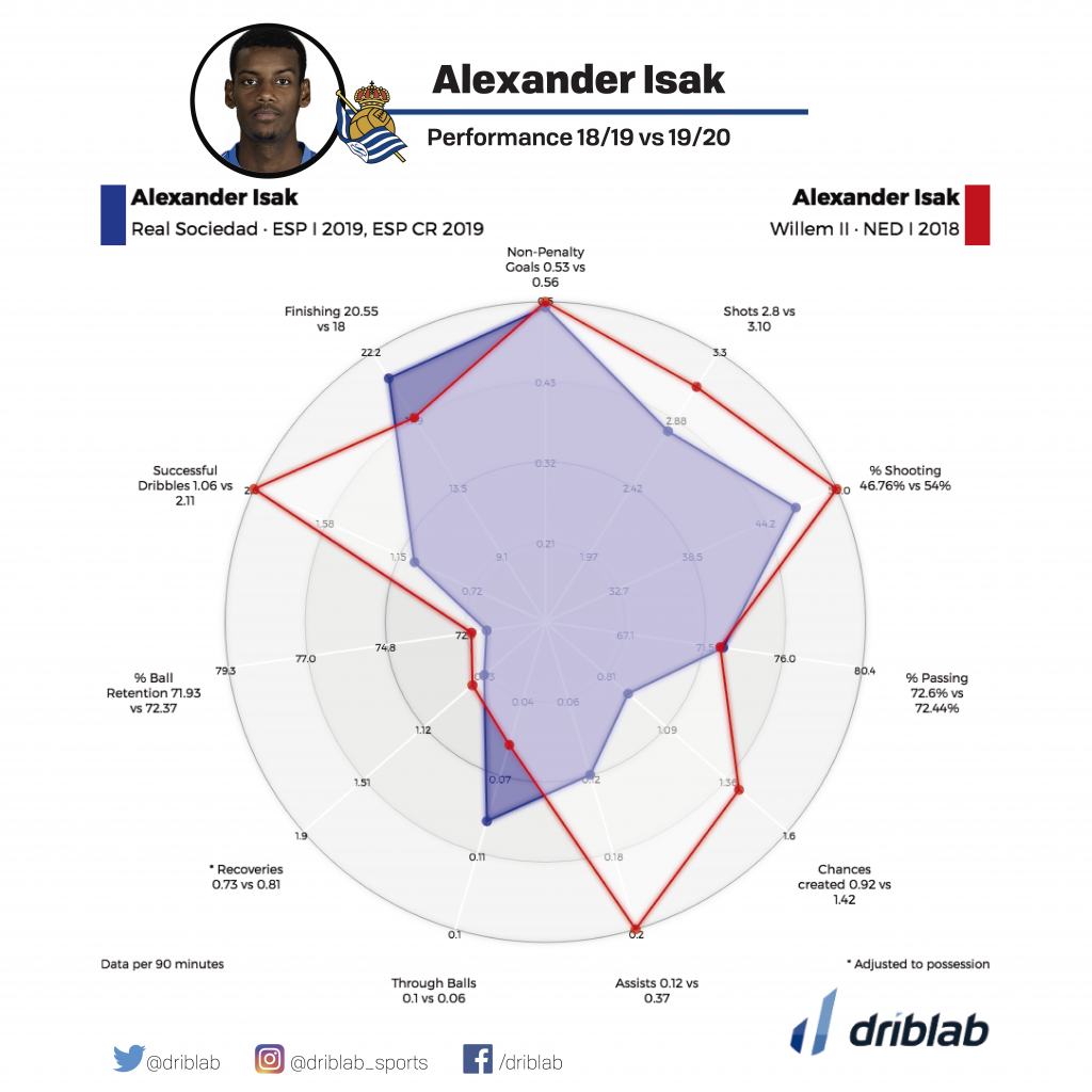The flow of goal scorers in Dortmund does not stop. If this year is Haaland who is setting the pace, last year it was Paco Alcácer who closed the door on Alexander Isak. In fact, the Swede had to leave in January to Willem II where in 16 games he scored 13 goals and 6 assists. After those promising months, Real Sociedad made a strong commitment to him and in his first year he has already produced results. His performance in Spain has not decreased in terms of the number of shots, goals per 90 minutes, passing percentage and even improved in finishing. At only 20 years old, he is already showing signs of scoring regularity and a complete profile also outside the box.